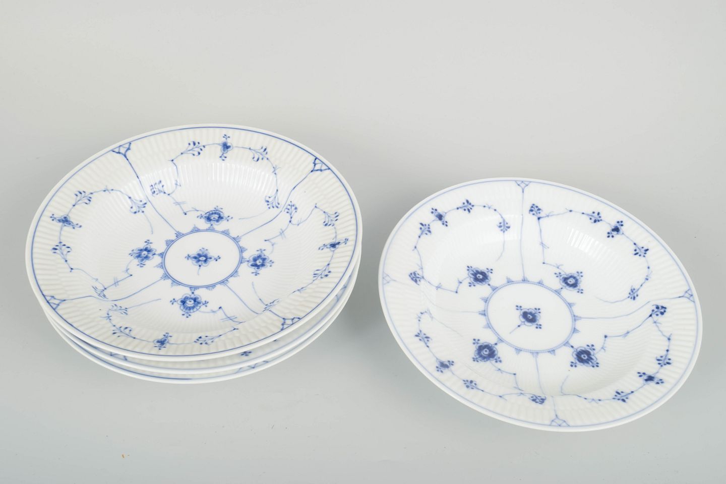 Set of four deep plates in classic Blue Fluted porcelain with hand-painted blue decoration and a fluted body.