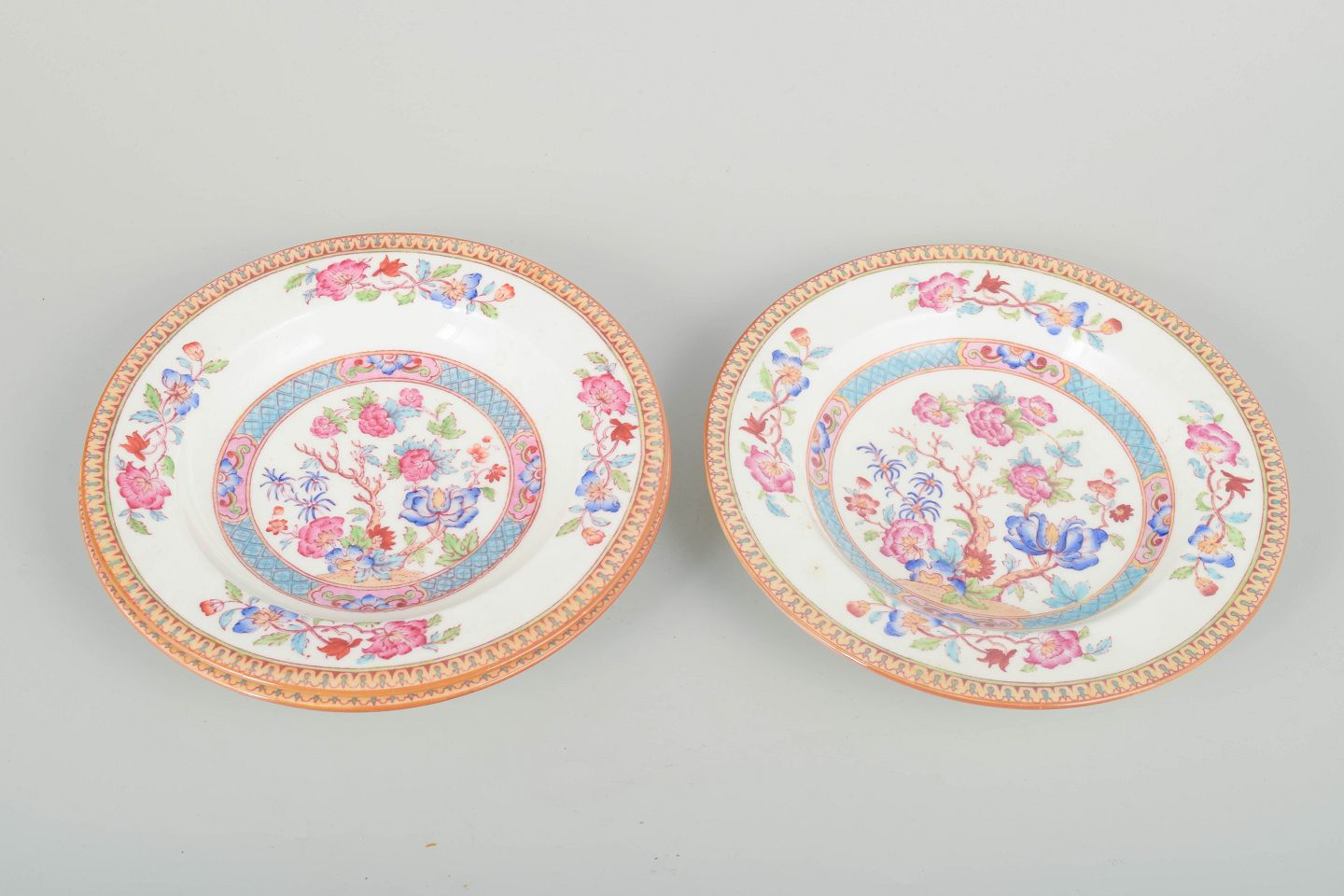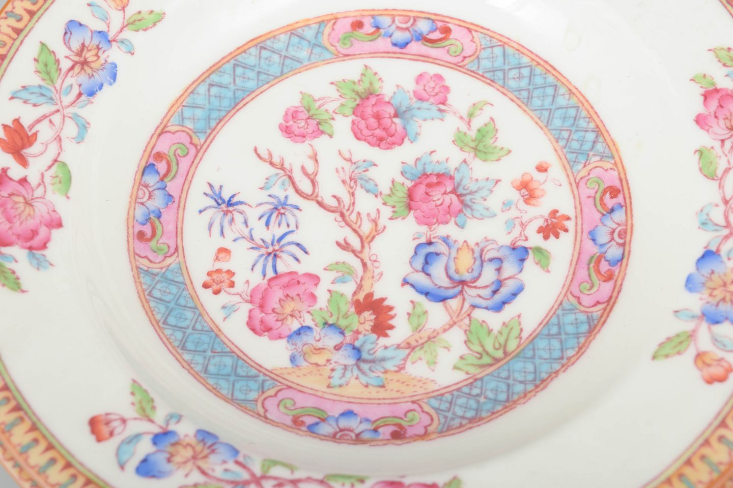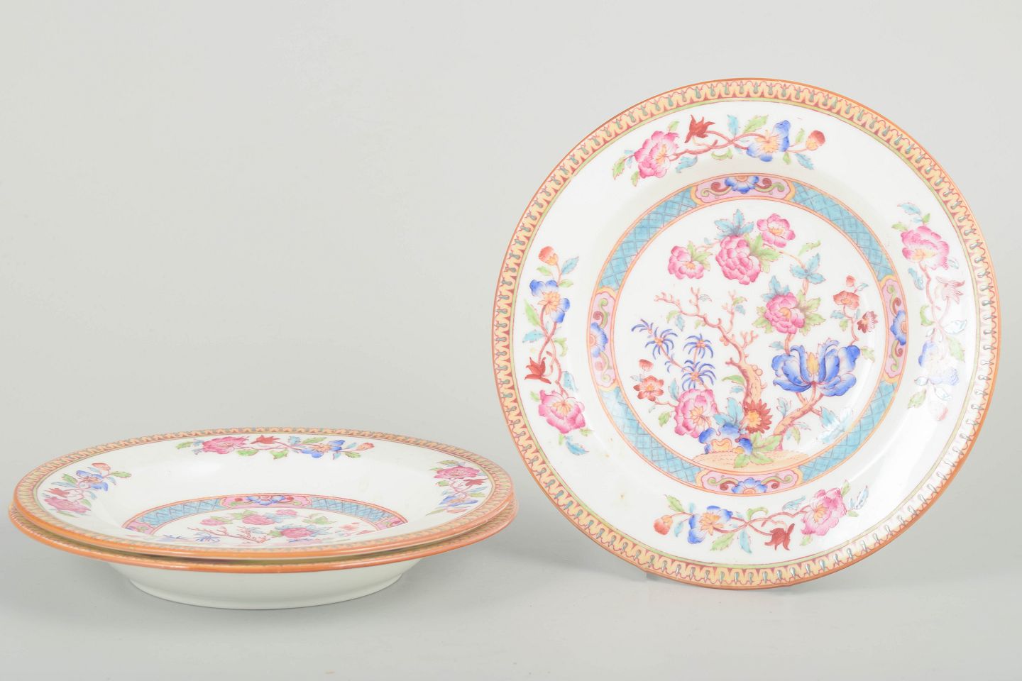 Set of three deep faience plates with colourful, orientalist-inspired floral decoration in pink, blue and turquoise tones. Classic Cauldon decoration with a warm-toned ornamental rim.