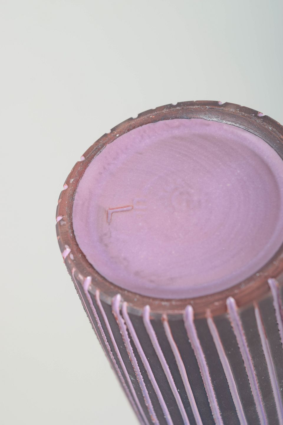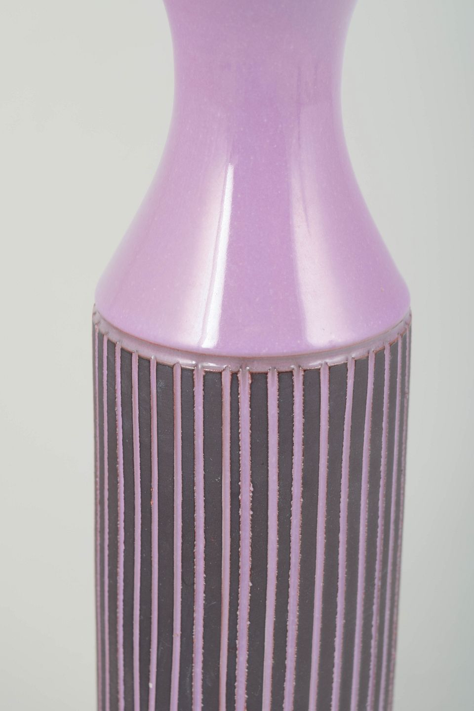 Tall cylindrical retro vase in purple glaze with hand-painted vertical striping in dark and light tones. A classic 1970s aesthetic with graphic decoration and an elegant, slender profile. The base is signed, though the signature is illegible.