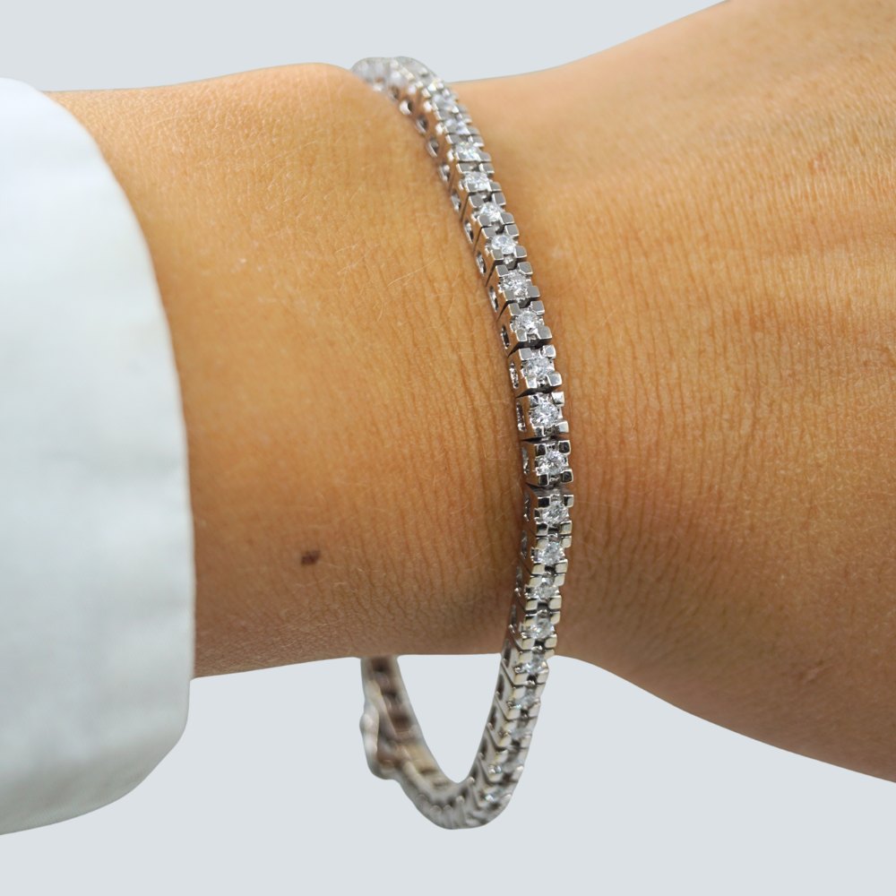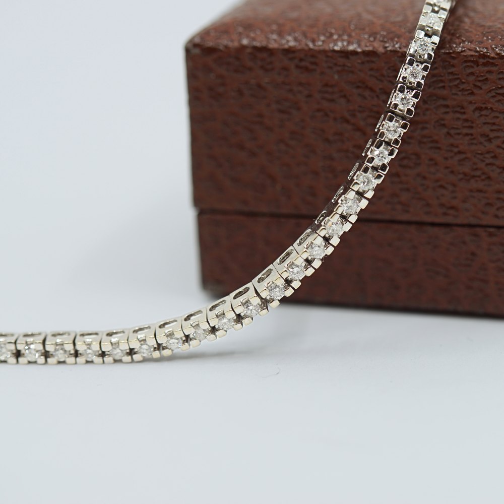 A tennis bracelet in 18k white gold set with diamonds, app. 1,53 ct. Wesselton - SI. Clasp with one safety catch.L. 18 cm. W 3 mm.