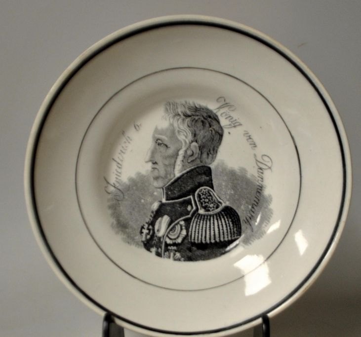 Coffee cup with saucer, faience, 19th century. With King Frederik VI's portrait and text in German: Friederich 6, König von Dannemark in transfer technique. Leg faience with green glaze lines. Cup: H.: 7.5 cm. Dia.: 12.5 cm. Saucer dia: 17 cm. The saucer is stamped with an anchor and BF 2.Frederick VI was King of Denmark between 1808 and 1839.