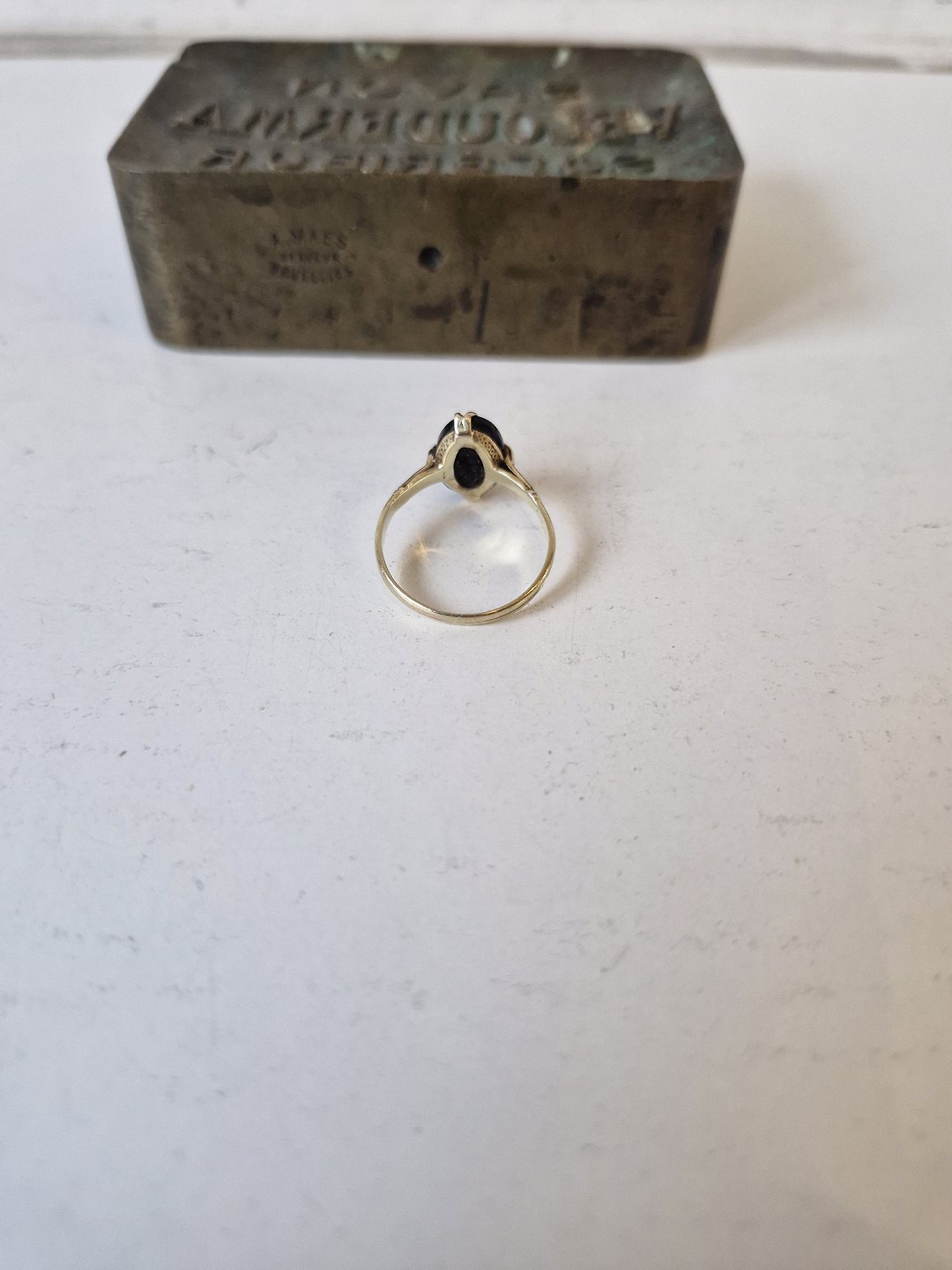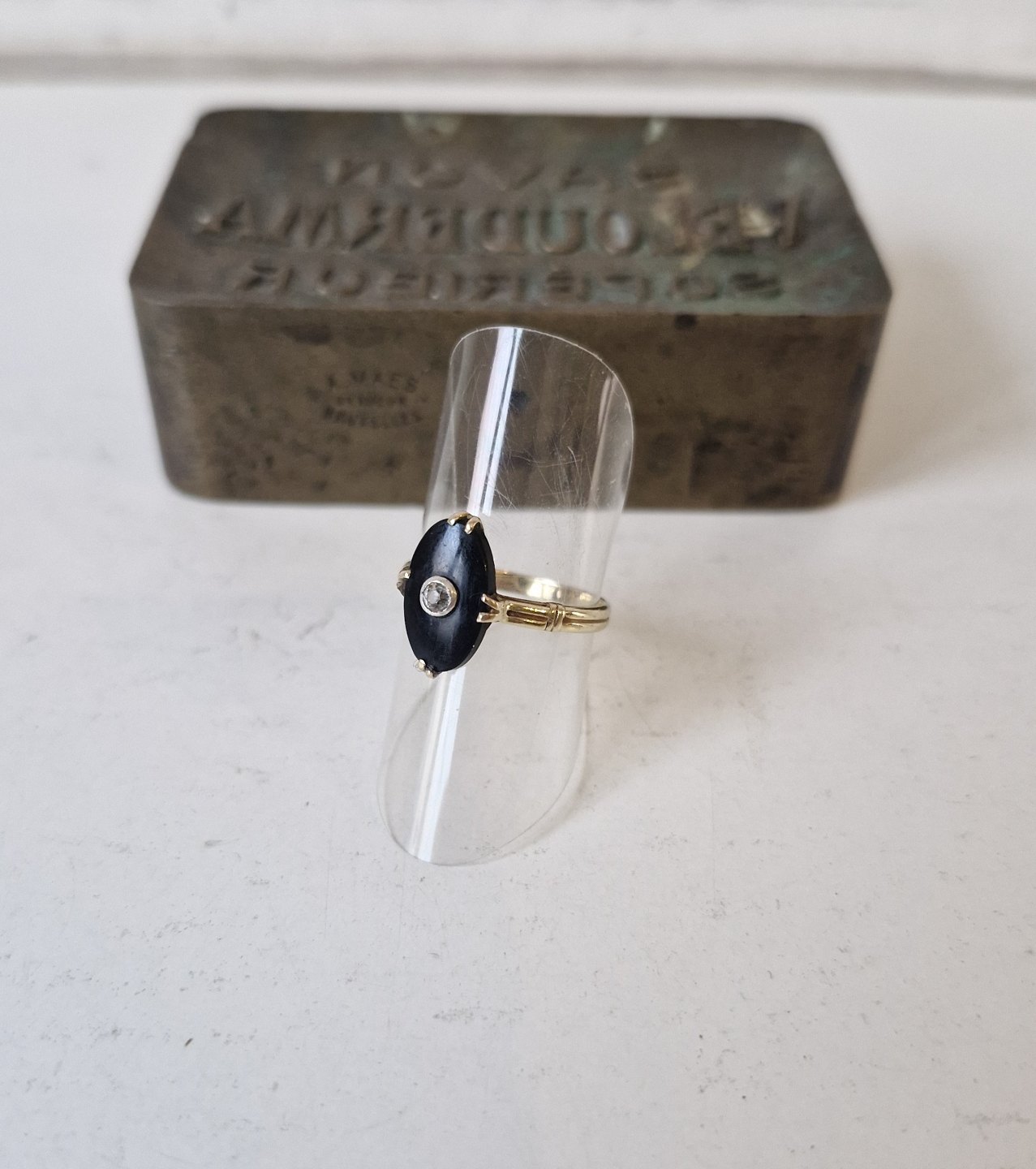 Beautiful old ring in 14 kt. gold with oval onyx adorned with old cut diamond.Stamp: 585 - GH