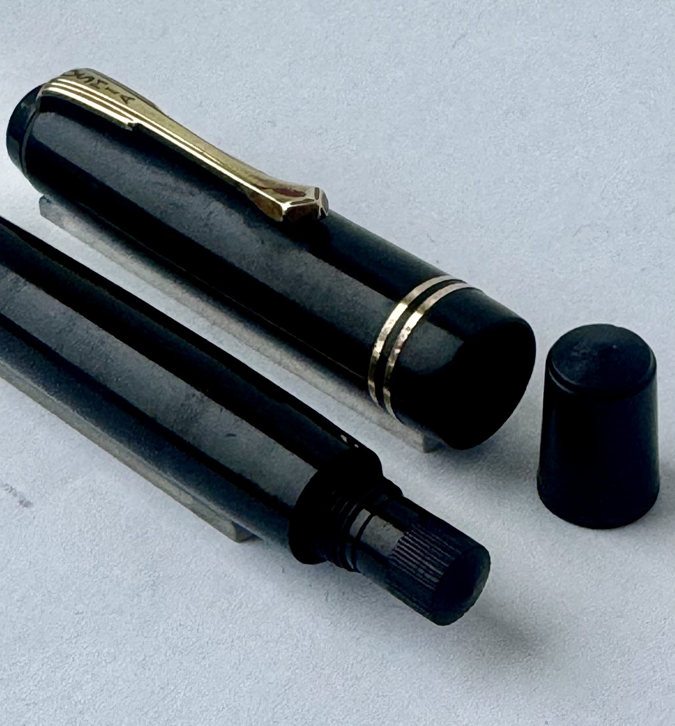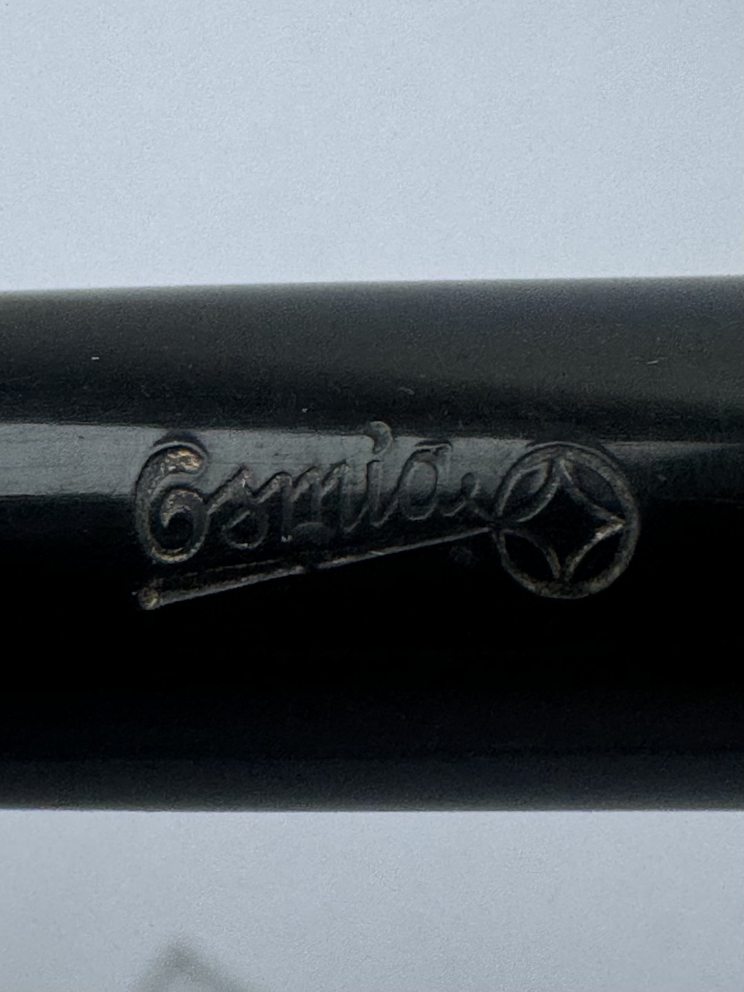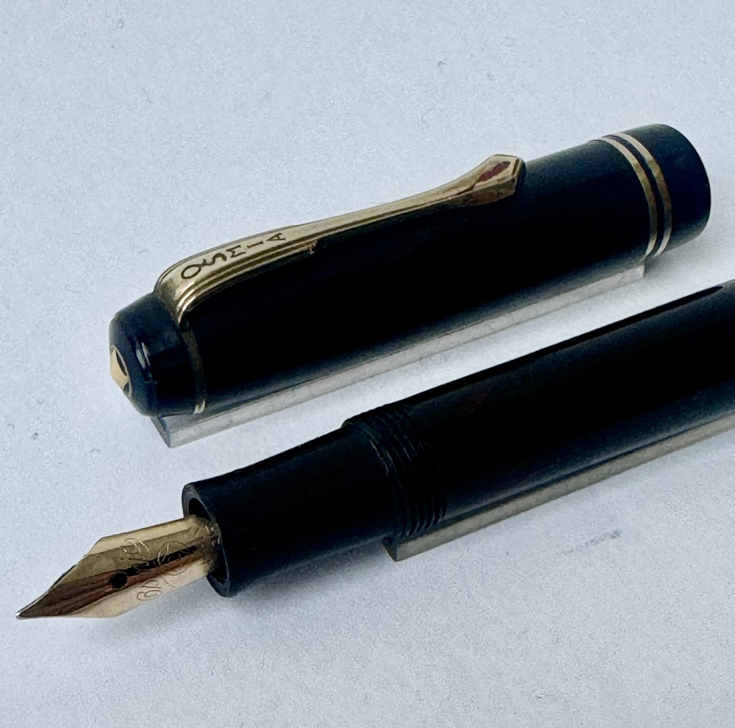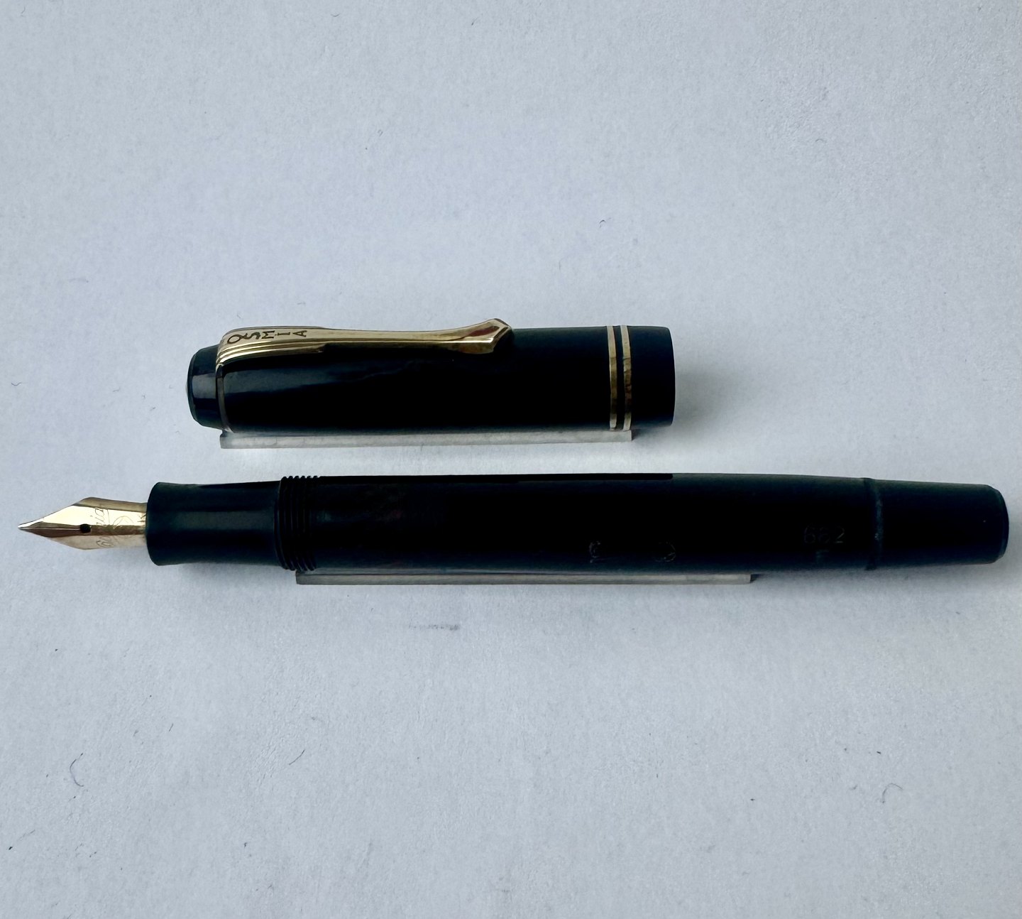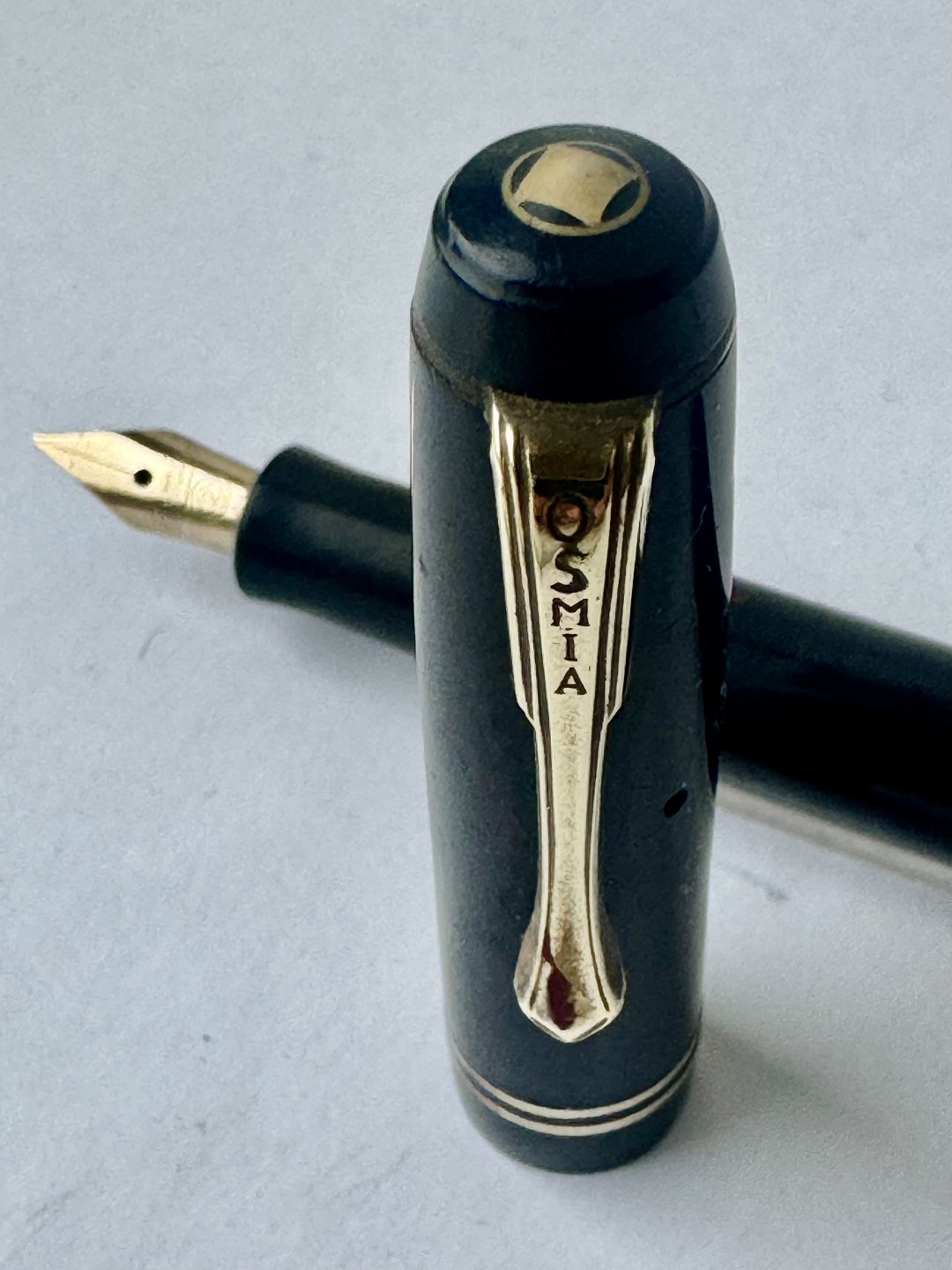 Black Osmia fountain pen with piston filler that needs to be repaired before the fountain pen can absorb ink and write again. Appears in good condition without damage. All parts original to this model including an Osmia number 2 gold nib in 14 carats. Length 11,5 cm Dealer