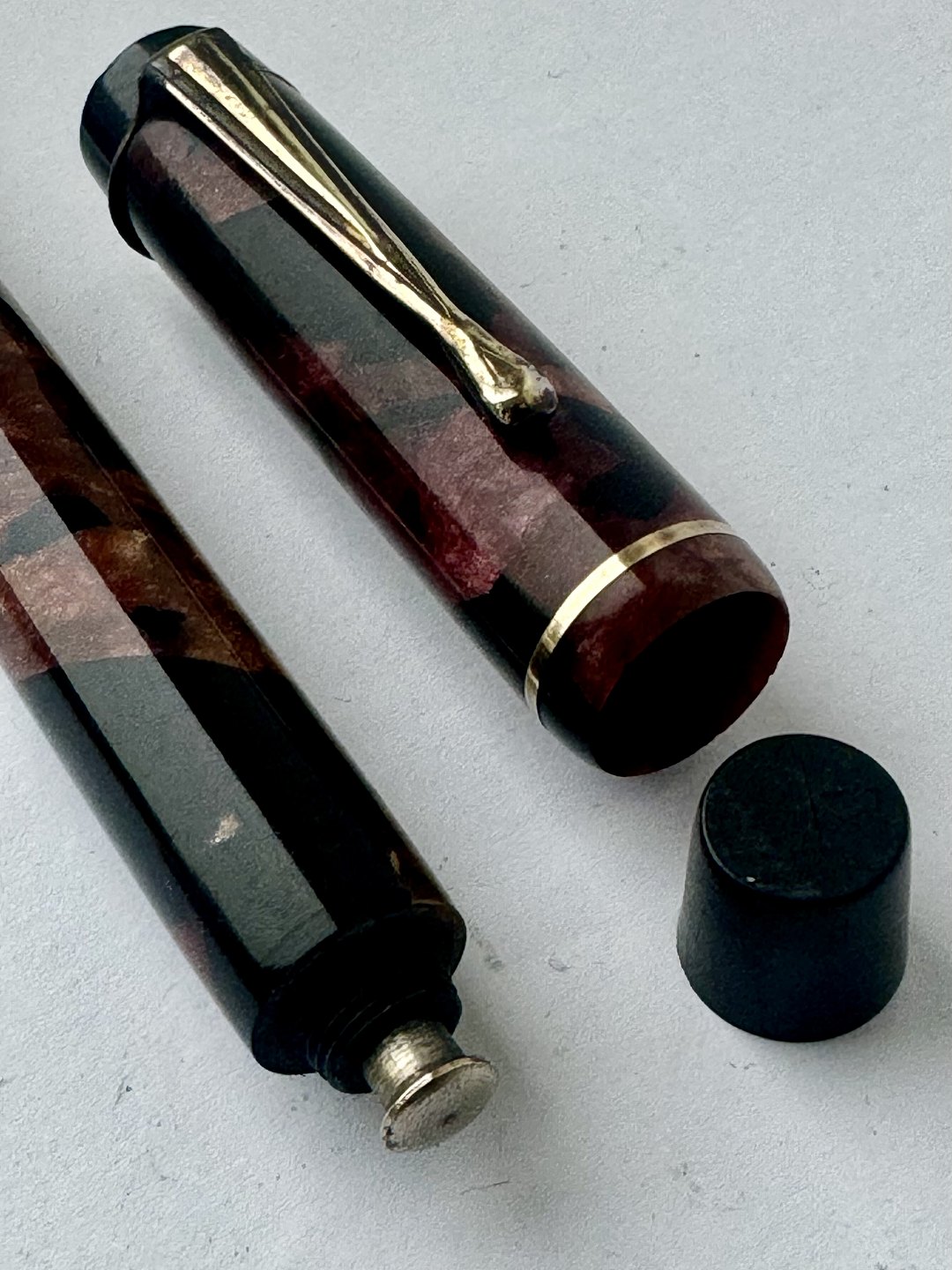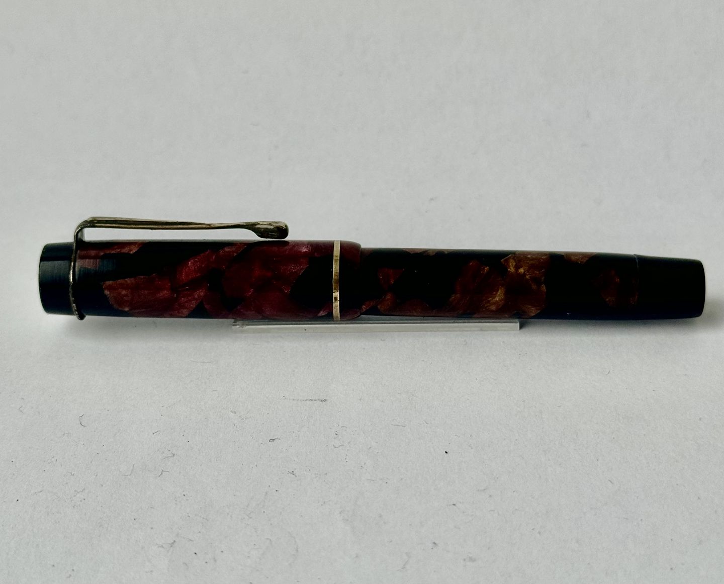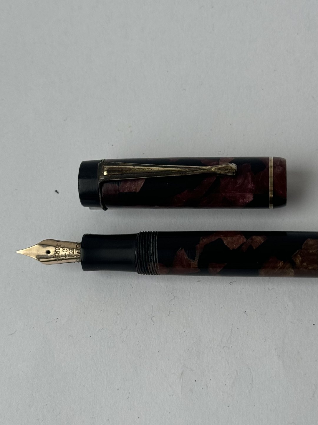 Black and red-brown marbled Penol. No. 1 fountain pen. Appears in good condition without damage or repairs. Does not work. A new rubber sack must be inserted before the fountain pen can absorb ink and write again. The tip is original Penol 14 carat gold tip. Length: 11,2 cm Dealer