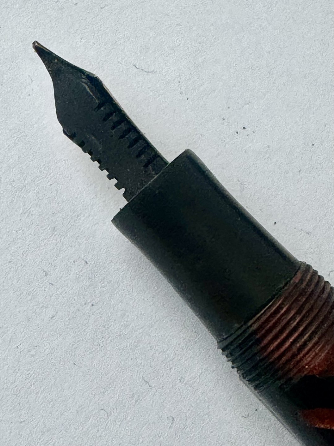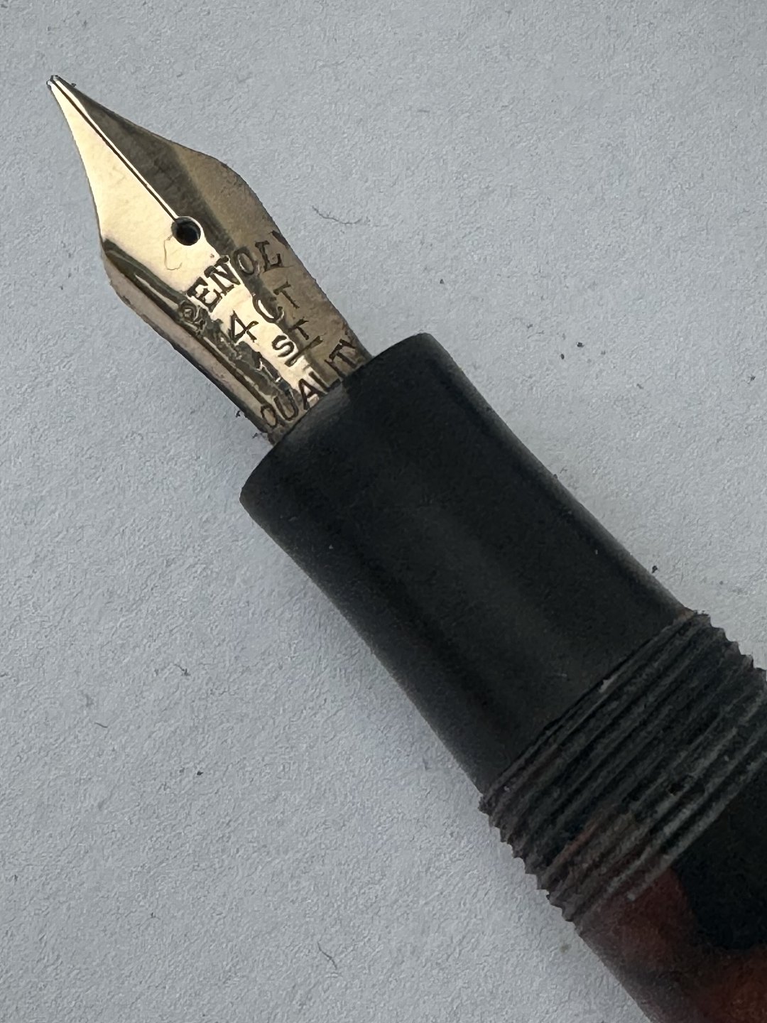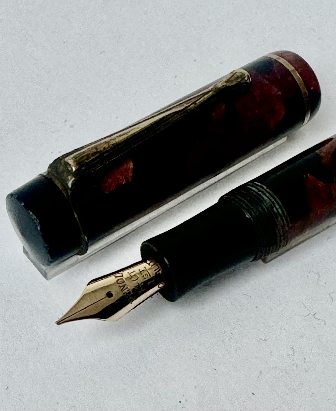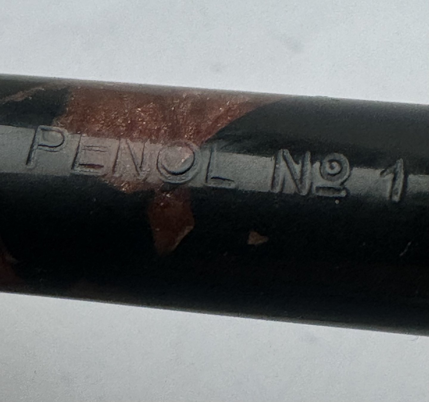 Black and red-brown marbled Penol. No. 1 fountain pen. Appears in good condition without damage or repairs. Does not work. A new rubber sack must be inserted before the fountain pen can absorb ink and write again. The tip is original Penol 14 carat gold tip. Length: 11,2 cm Dealer