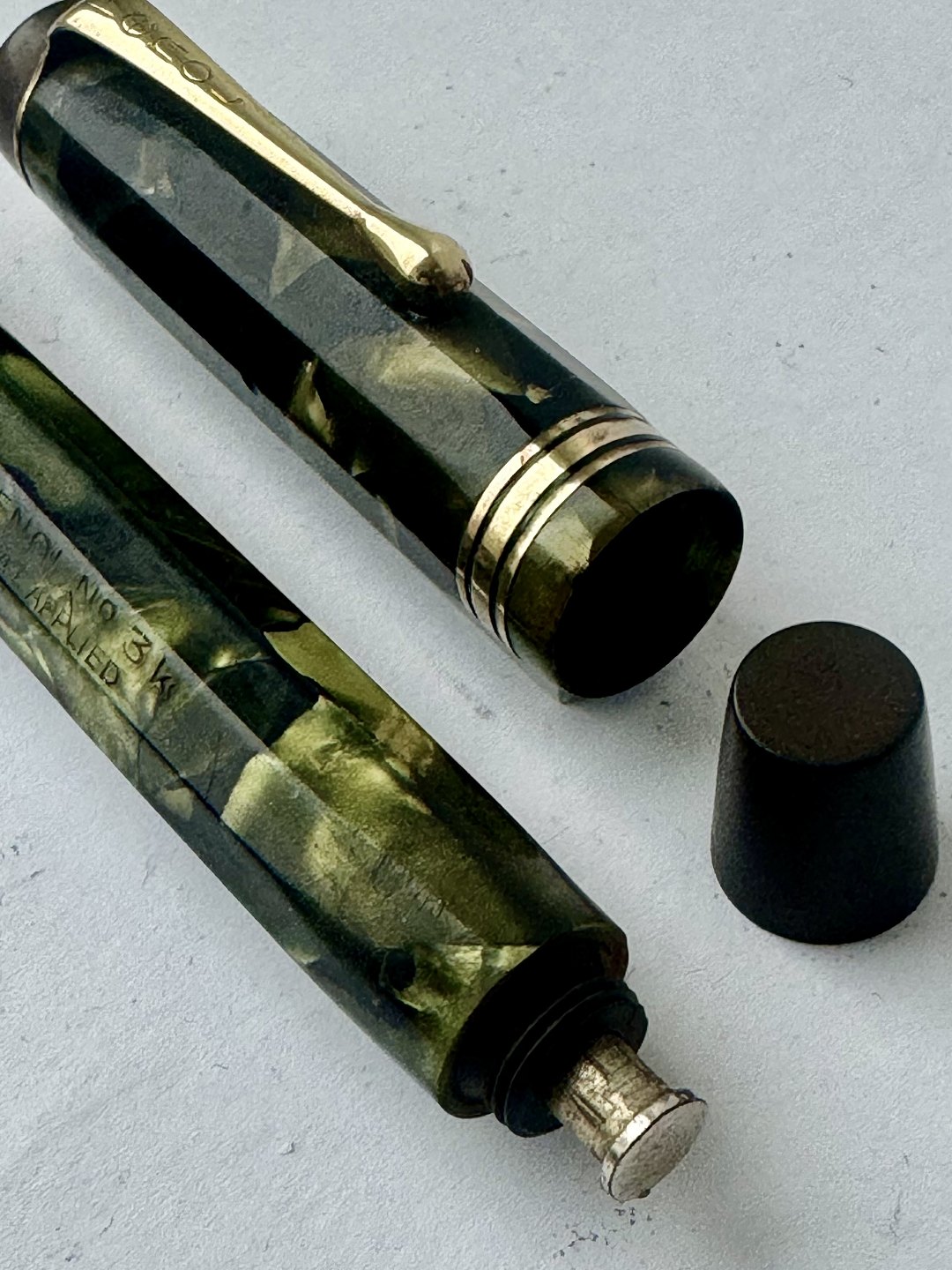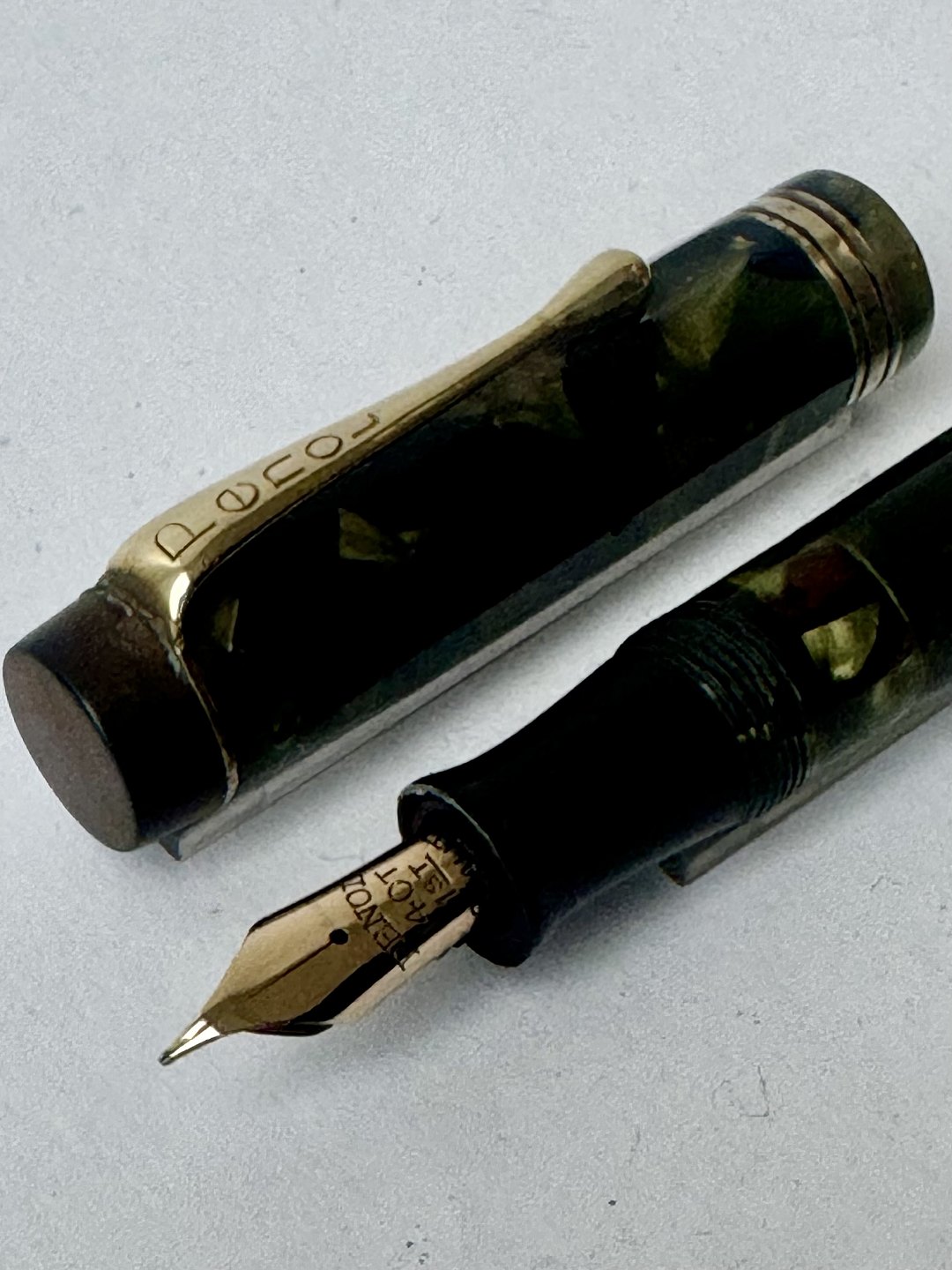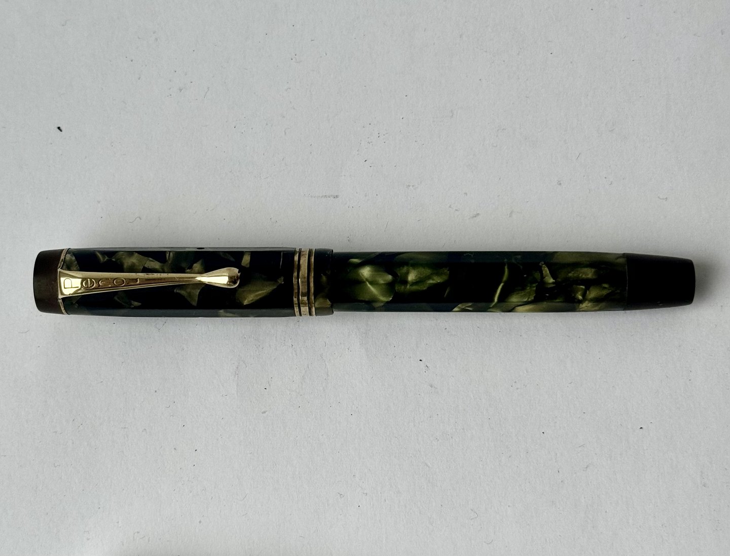 10-sides and green marbled Penol 3k fountain pen. In good condition with all original Penol parts. Including a 14 carat gold nib. A new rubber sack must be inserted so that the pen can absorb ink and write again. Length: 13.3 cm. Dealer