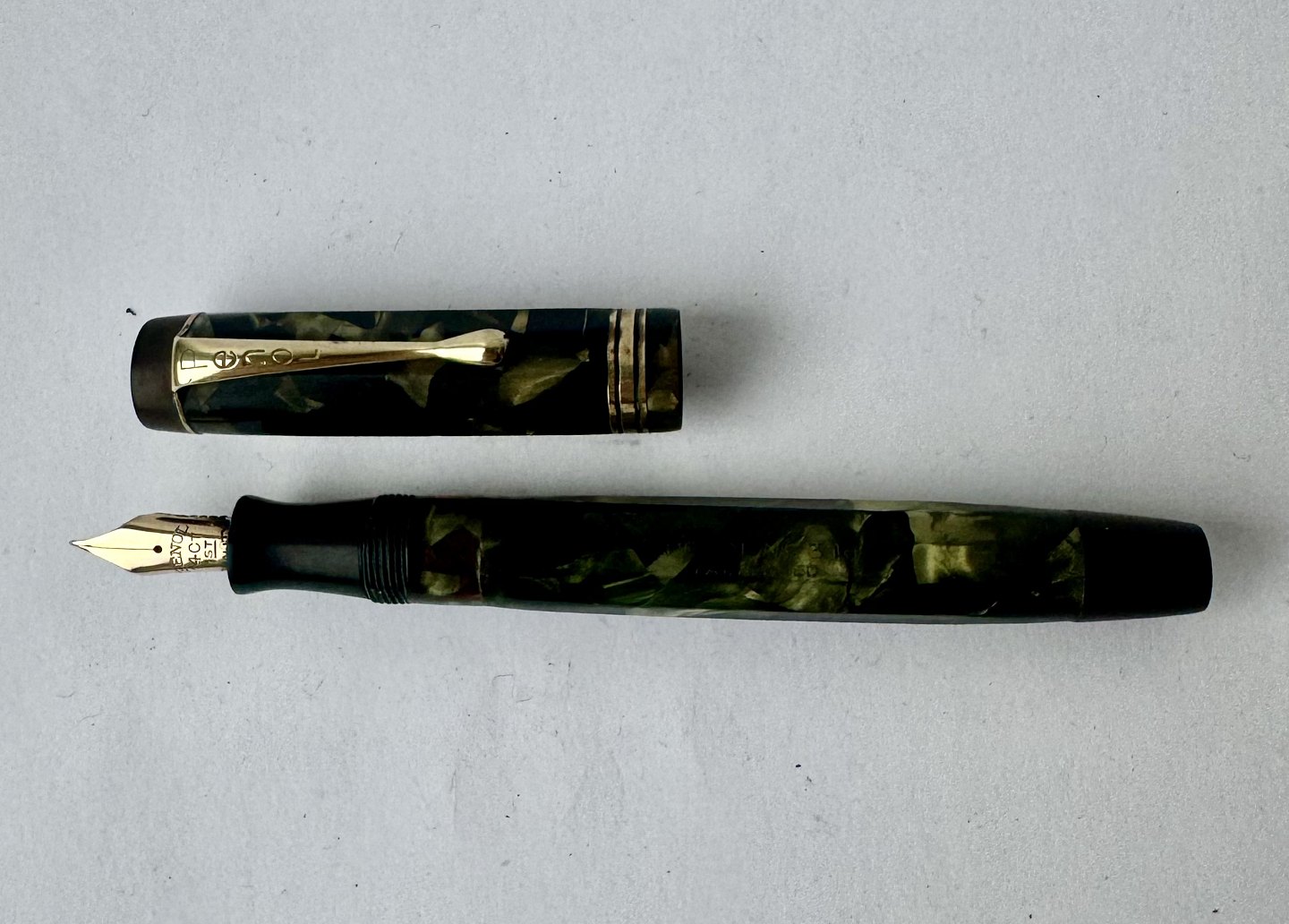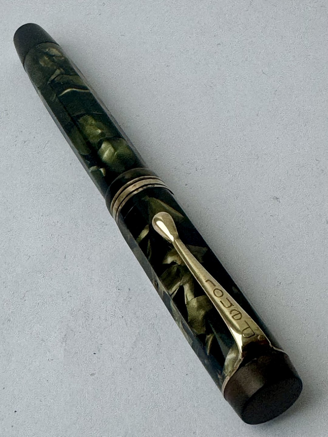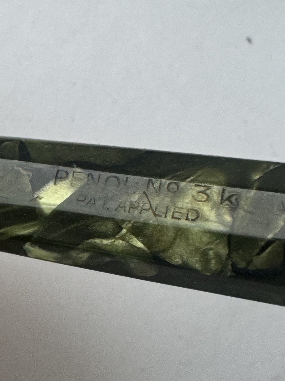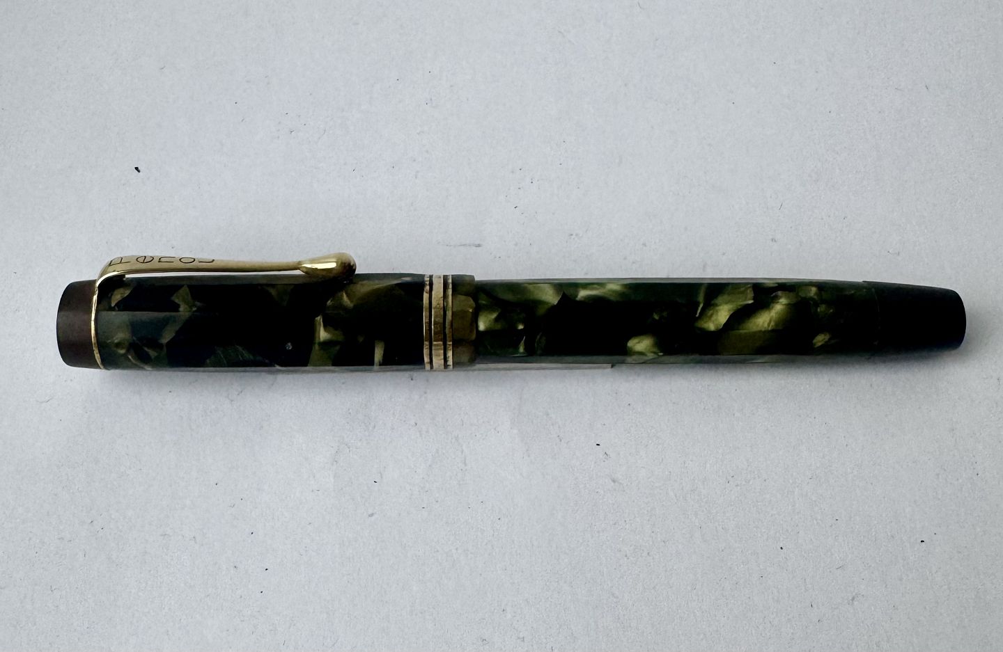 10-sides and green marbled Penol 3k fountain pen. In good condition with all original Penol parts. Including a 14 carat gold nib. A new rubber sack must be inserted so that the pen can absorb ink and write again. Length: 13.3 cm. Dealer