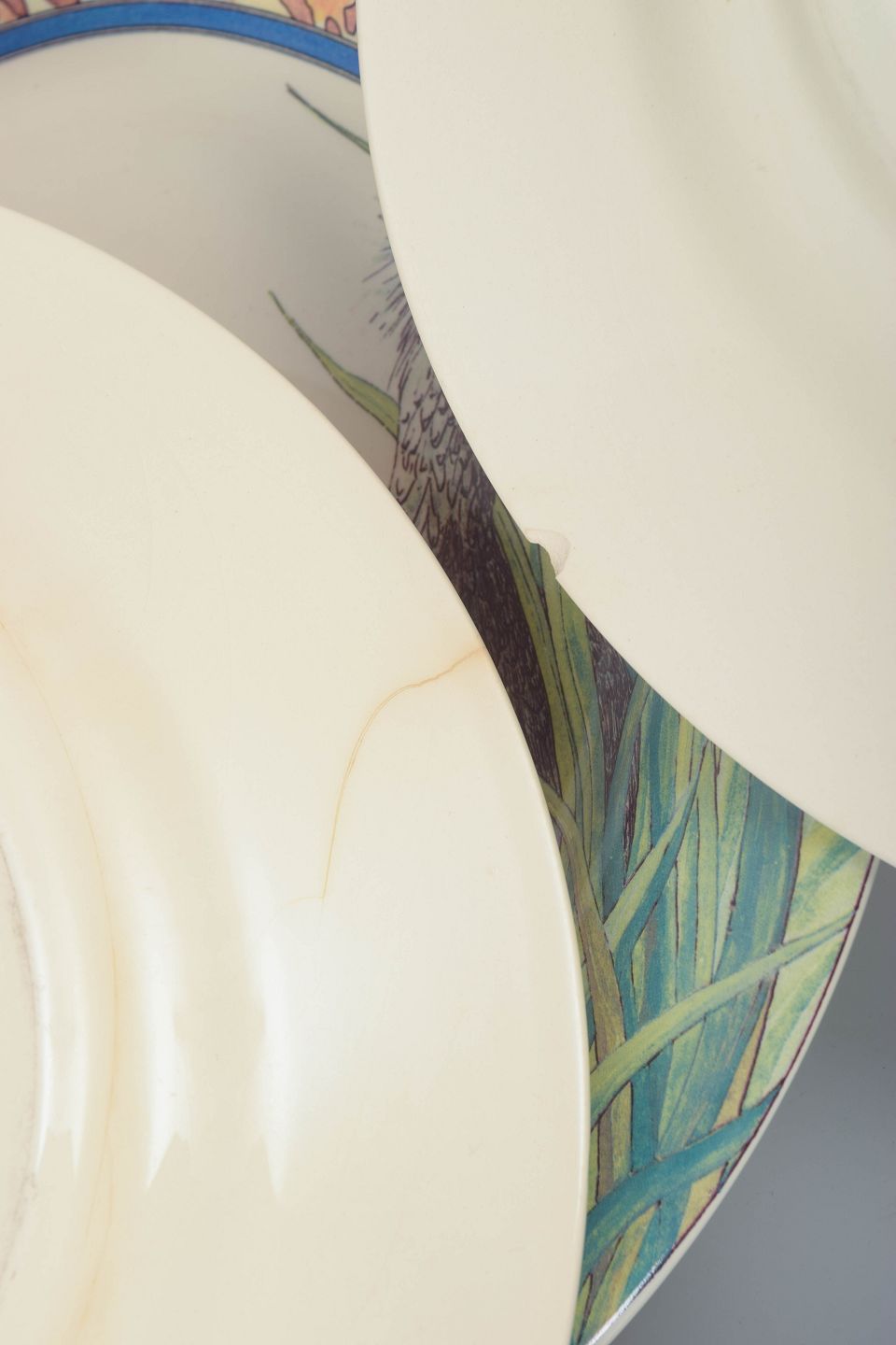 Decorative faience plates by Gien in the colourful, nature-inspired “Savane” pattern with its characteristic border and motif. A complete set of six plates.