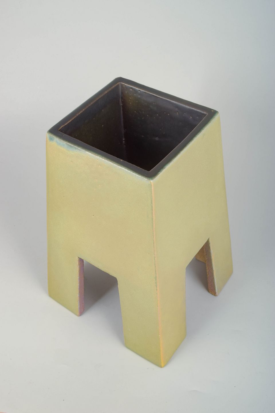 Sculptural, geometric stoneware vase with a matte, hand-glazed surface in soft muted tones. A characteristic example of Mobach’s modernist studio production, even when unsigned.