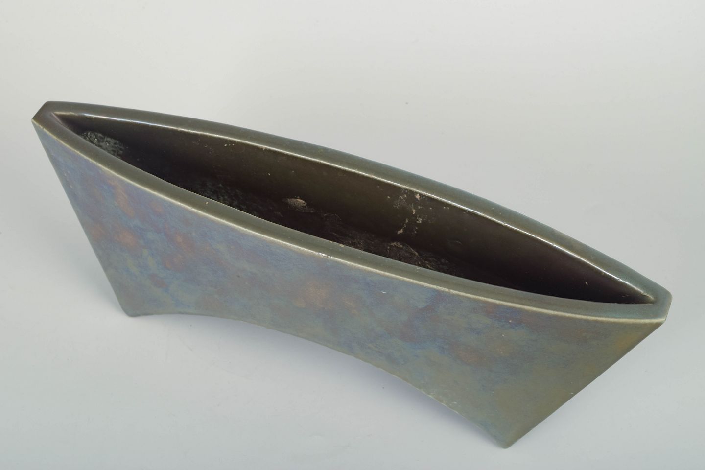 Hand-glazed and signed vase in a characteristic asymmetrical shape, crafted in stoneware with a subtle iridescent surface and a clean, modern expression typical of Mobach’s 1970s output.