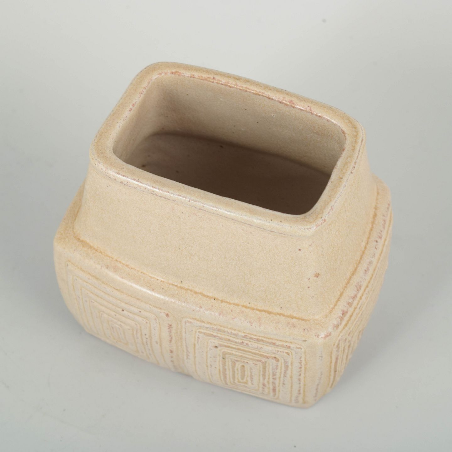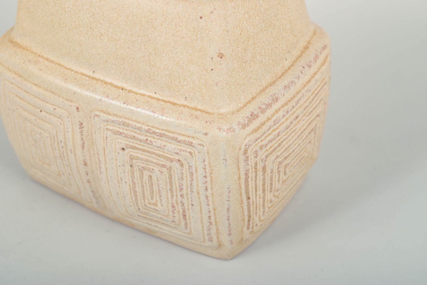 Hand-glazed stoneware vase in a light matte glaze with impressed geometric relief decoration. The sharply modelled, angular form is characteristic of L. Hjorth’s modernist stoneware production during the mid-century period.