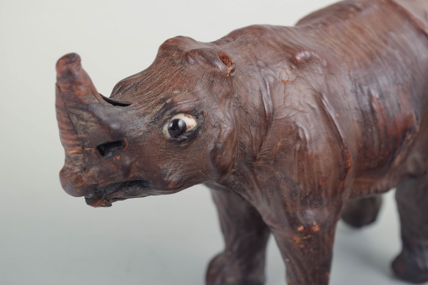 Omersa for Liberty & Co., London – Small Leather Rhino Figure, Mid-20th CenturyHandmade rhinoceros figure crafted in shaped and stitched leather, possibly retailed by Liberty & Co., London. Features modelled details, glass eyes and a dark patinated surface that enhances its artisanal character.