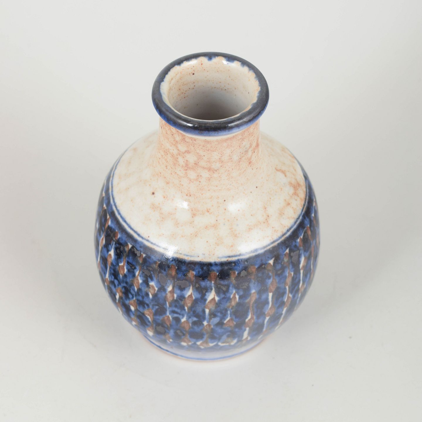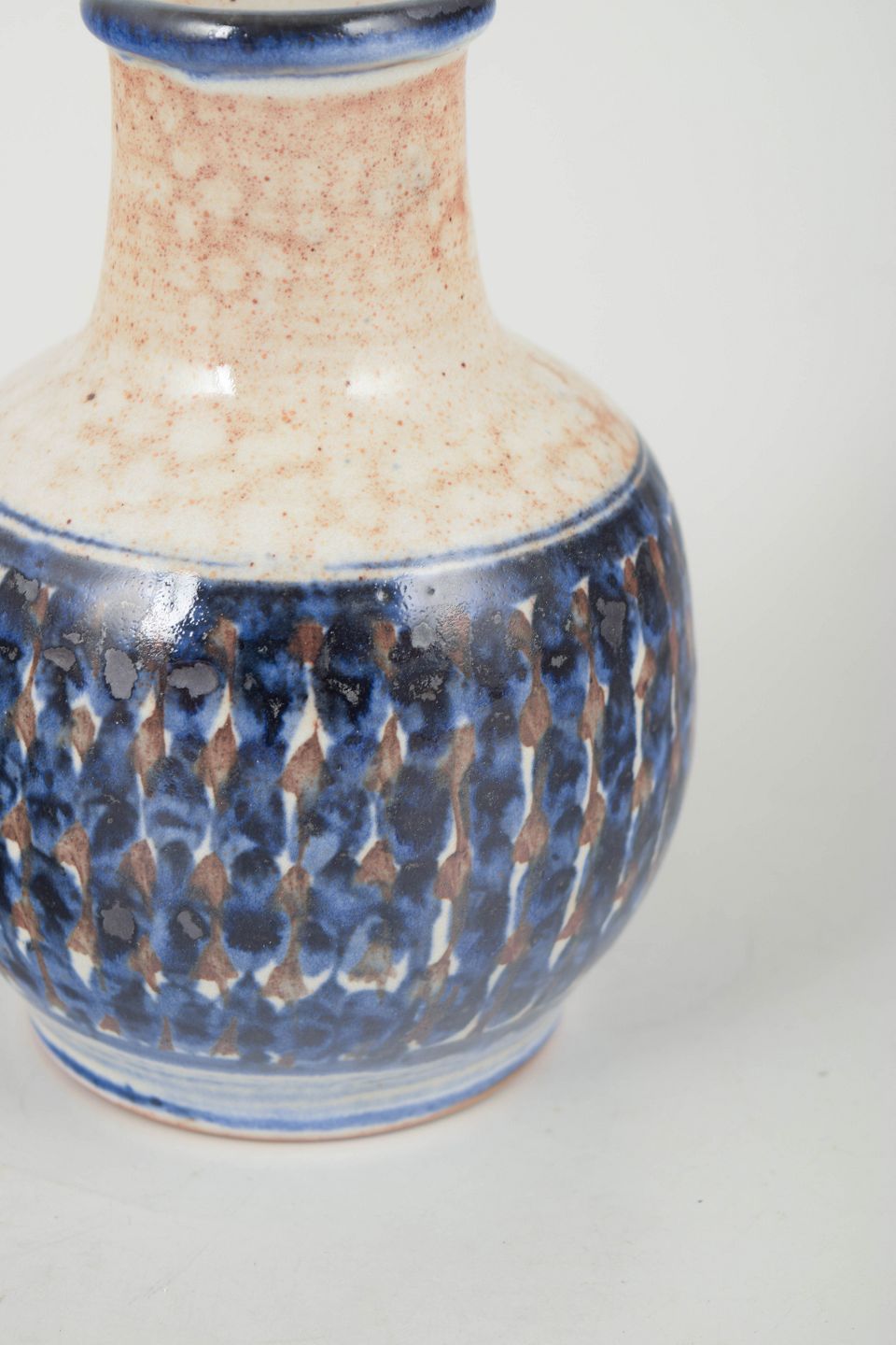 Hand-thrown stoneware vase with a cylindrical neck and rounded body, decorated with a tactile hand-painted blue and brown relief glaze and a softly speckled light upper section – a fine example of Hjorth’s signature textured surfaces.