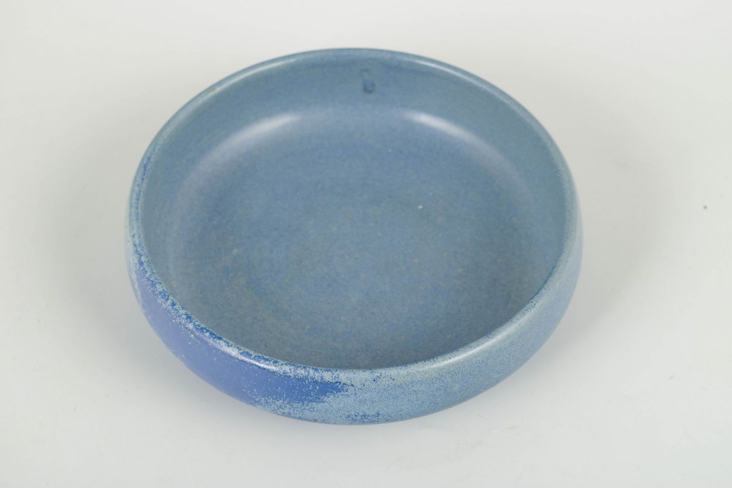 Hand-thrown stoneware bowl in a low, rounded form with a matte blue glaze in gently varied tones, characteristic of Hjorth’s experimental surface treatments of the period.