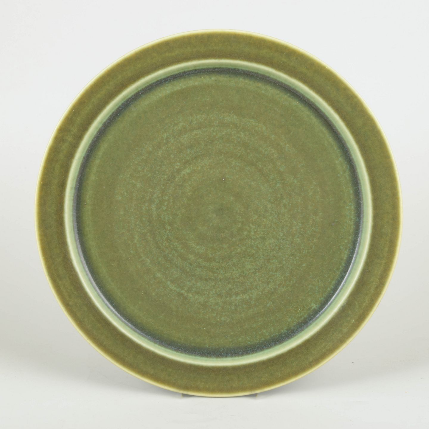 Large, simply shaped stoneware dish in the classic Saxbo style, featuring the characteristic matte, nuanced green glaze. The calm form and deep tonal quality reflect the workshop’s refined modernist aesthetic.