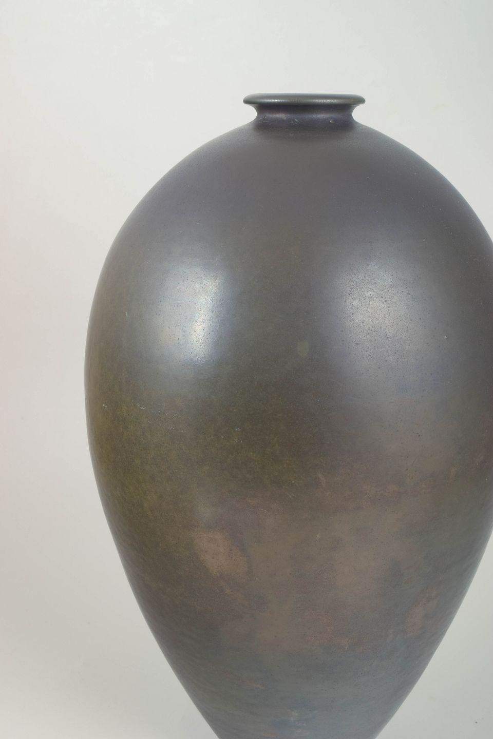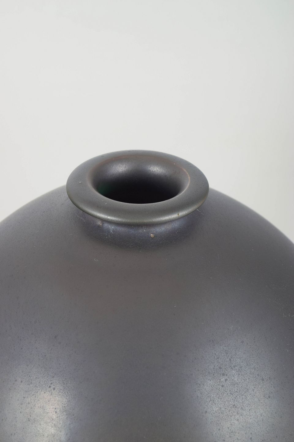 Monumental håndglaseret vase i stentøj med dyb, mat skifergrå overflade og subtile farvespil. Den ovale, stramt kontrollerede form afsluttes af en lille, indsnævret munding.