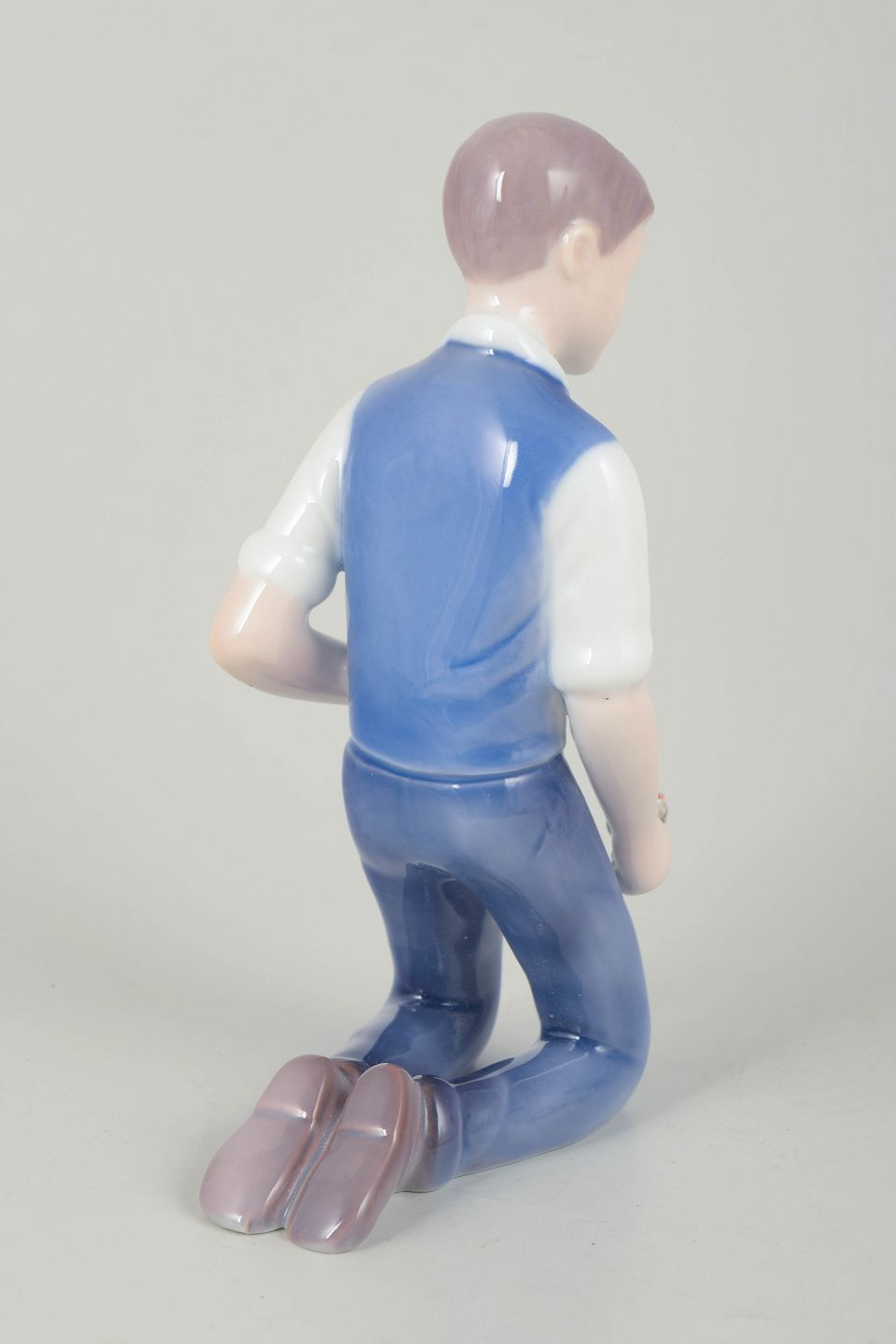 Porcelain figure of a kneeling boy holding flowers, executed in classic glossy glaze with soft blue and pink tones.