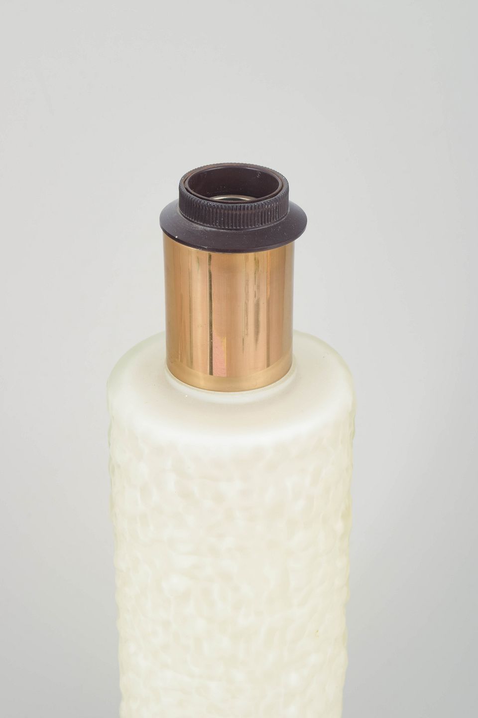 Swedish design – glass and brass table lamp, 1970sElegant table lamp in textured white pressed glass with a cylindrical brass top. Original approx. 2-metre cord. A characteristic example of 1970s Scandinavian lighting with a refined contrast between materials.