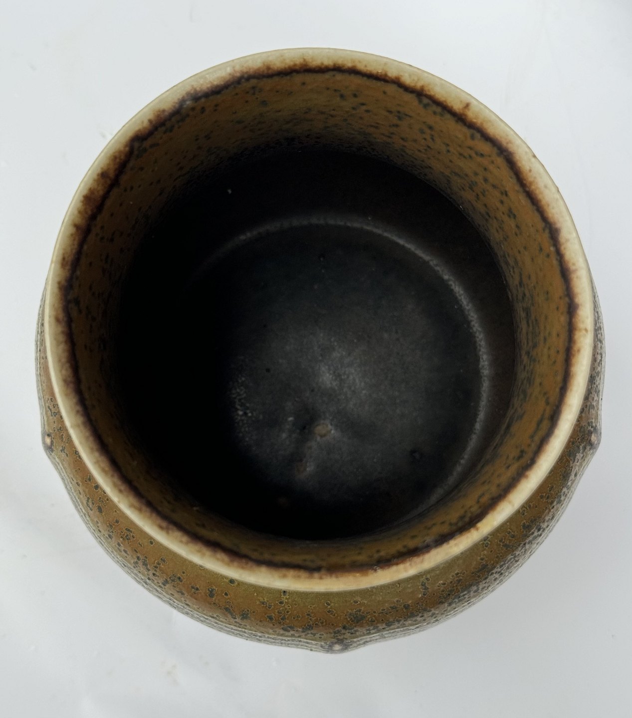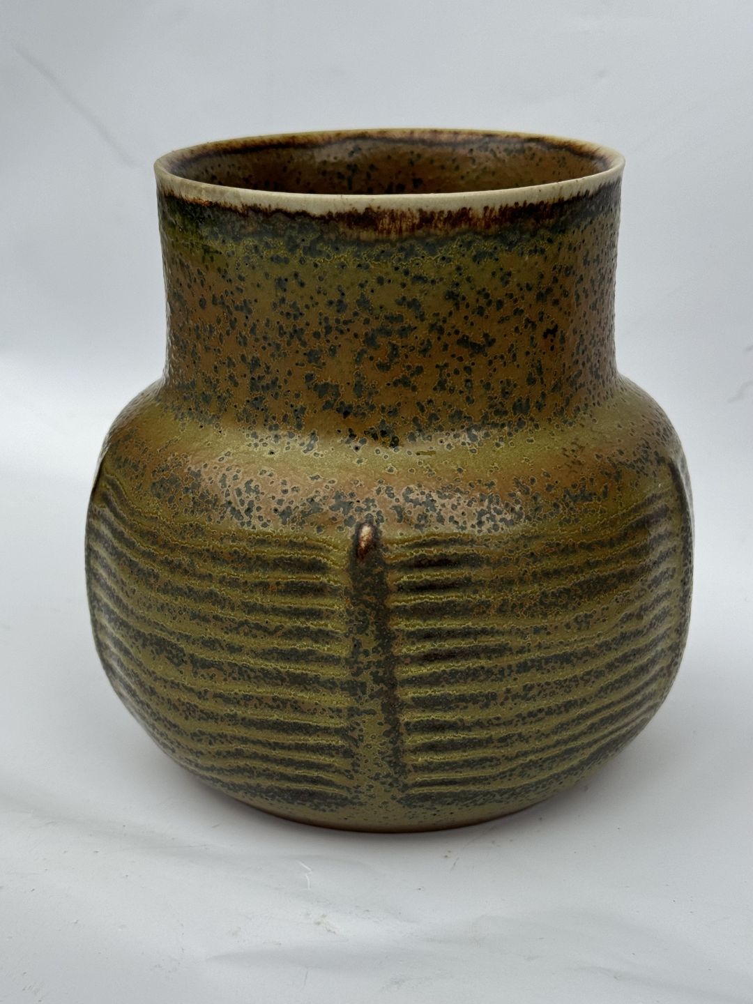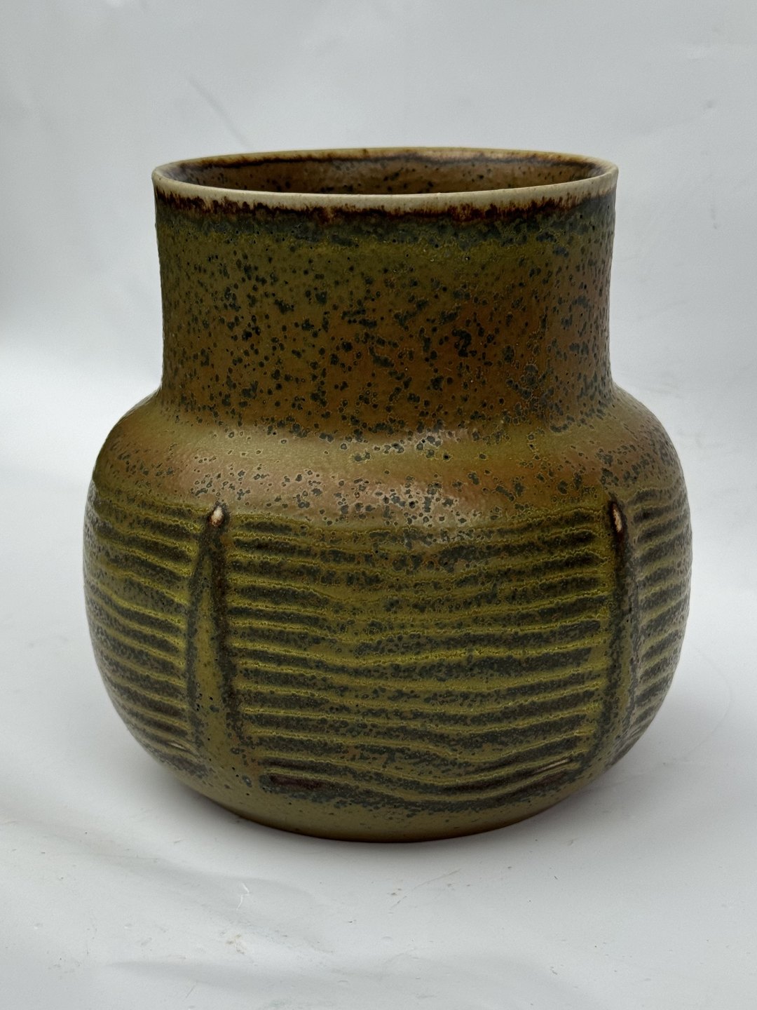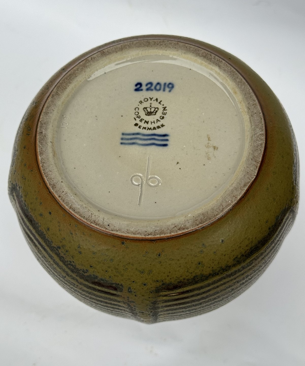 Royal Copenhagen stoneware vase. Designed by Gerd Bøgelund Covered with a green solfatara glaze. Factory first quality. Factory mark on the bottom. Artist's signature gb incised. H. 13.3 cm. In good condition. Diameter in the middle of the vase approx. 13 cm Dealer
