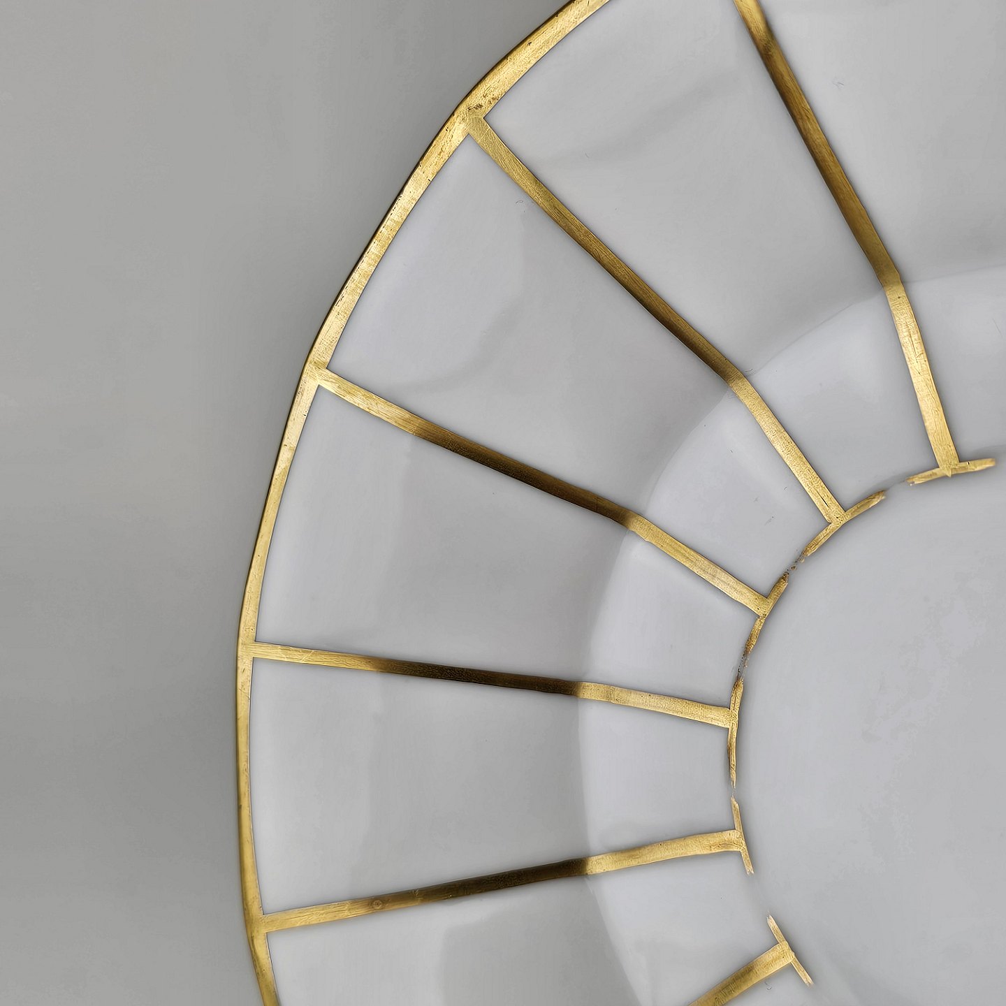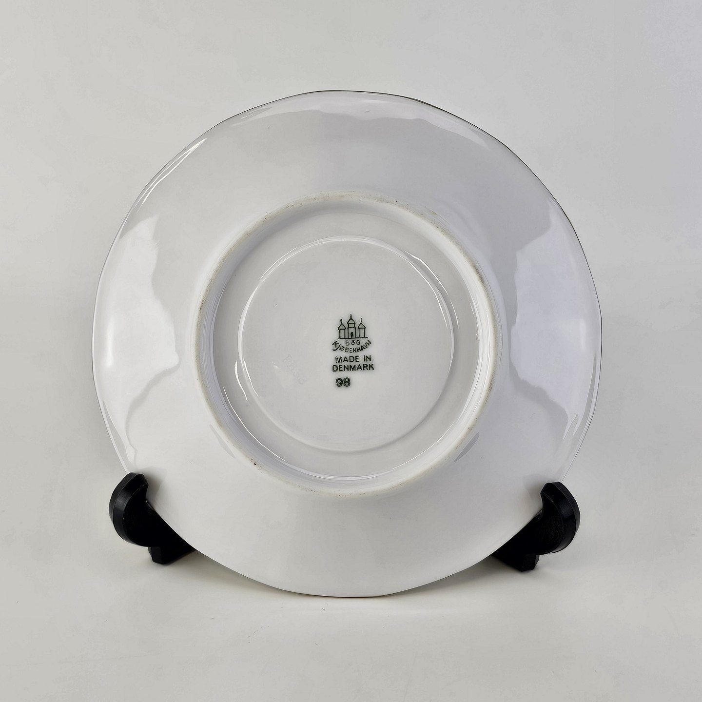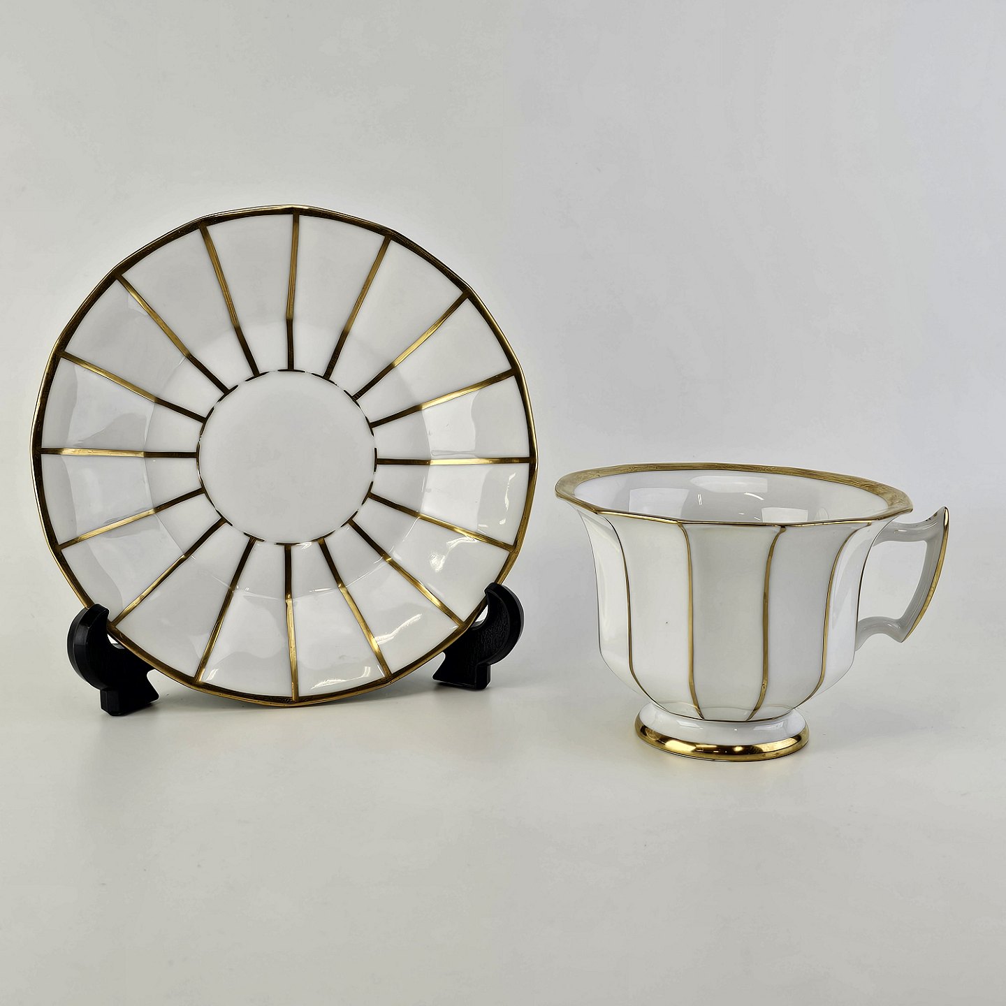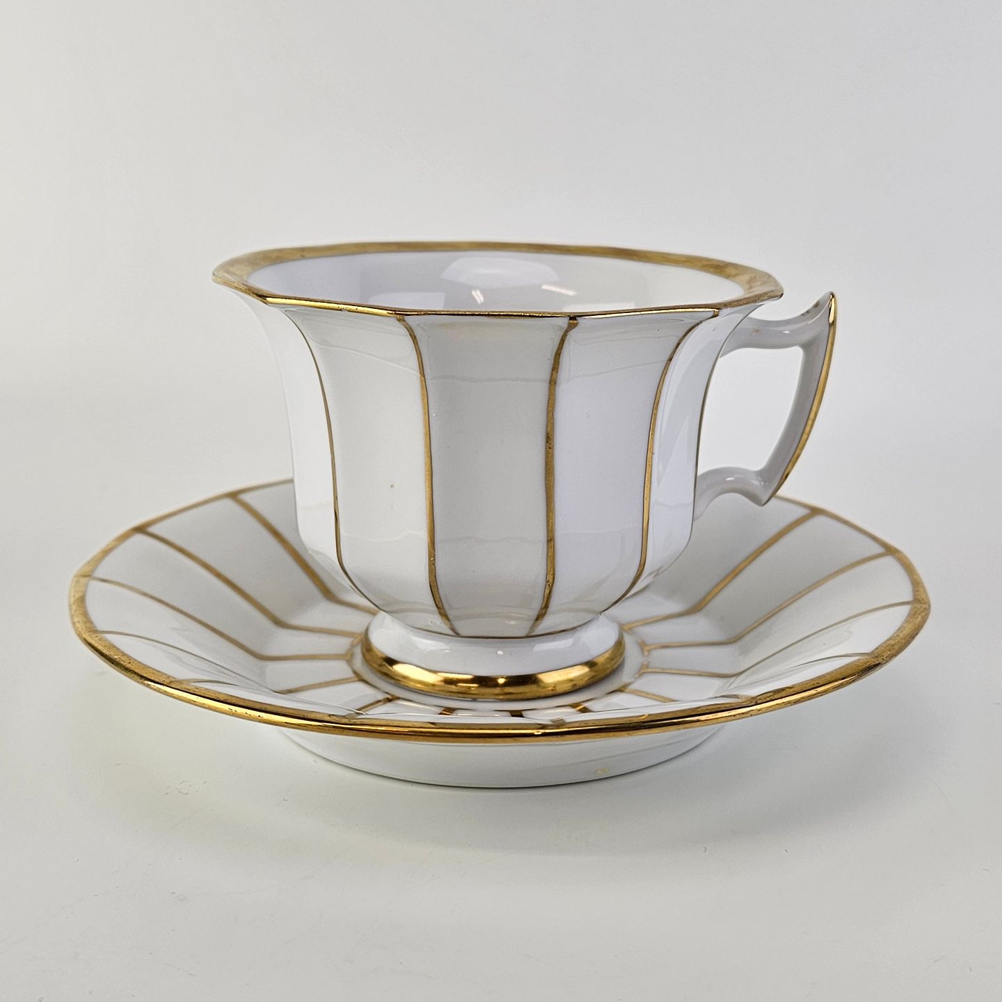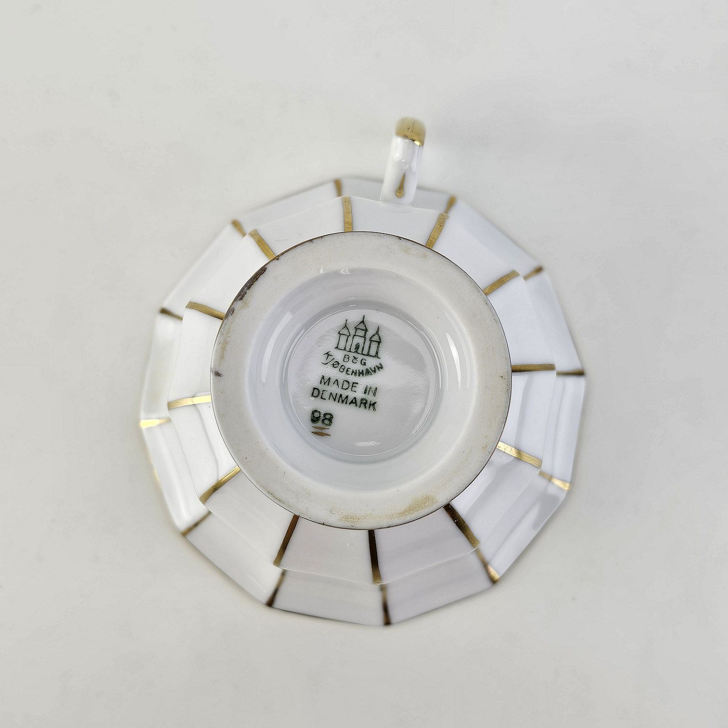 Kop og underkop med kantet form i hvidt porcelæn med gulddekoration og guldkant Nr. 98