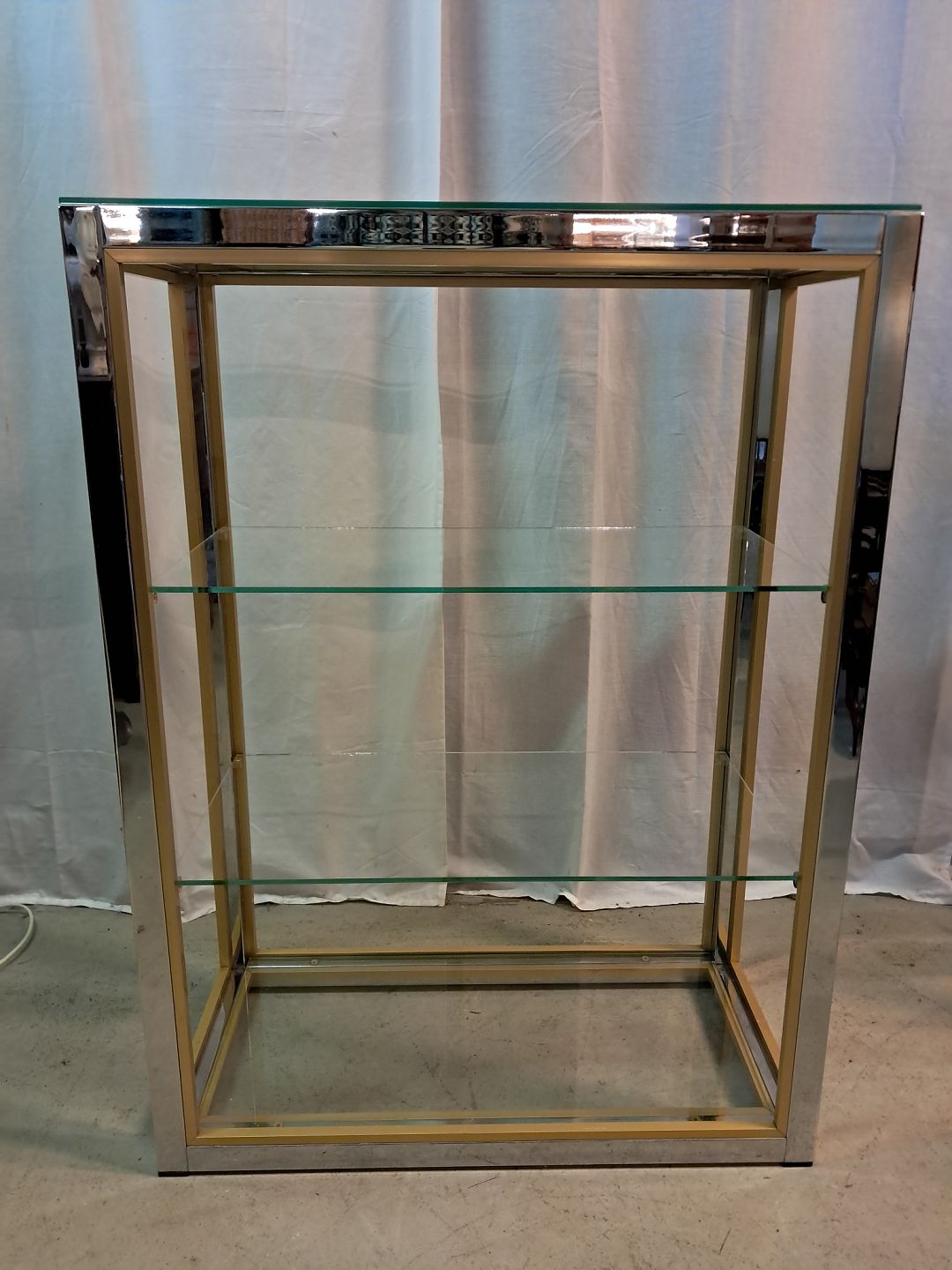 Forkromet reol i metal med glashylder, fra 1980erne.Den har brugsspor.