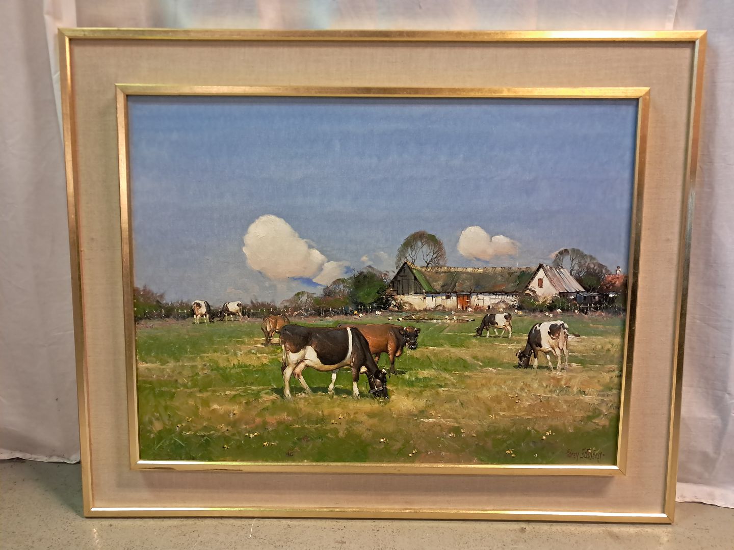 Maleri af bondegård, fra 1950erne.Højde 82cm Bredde 101cm