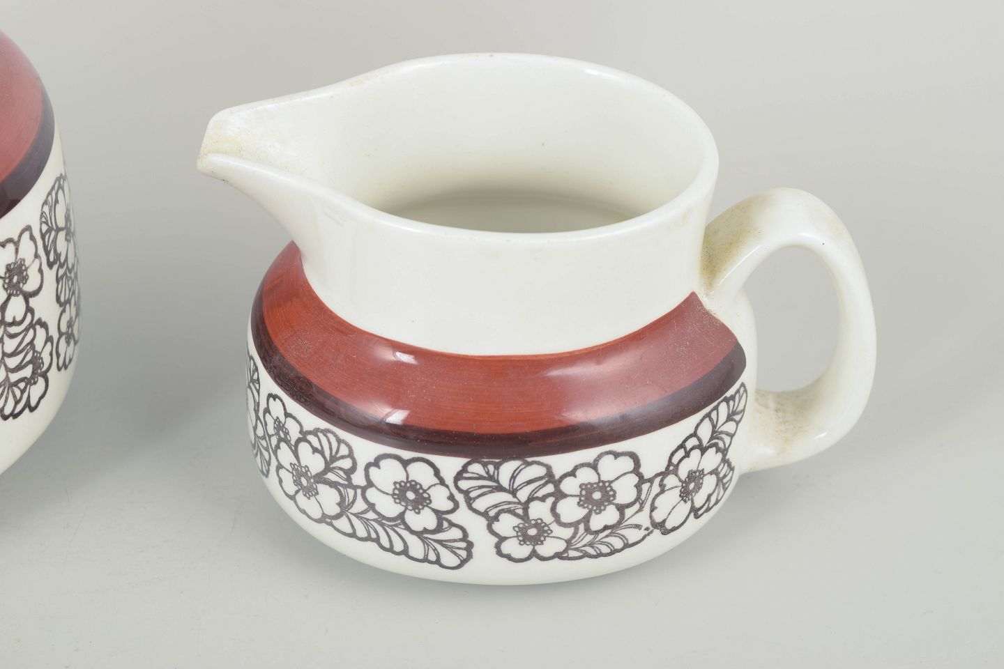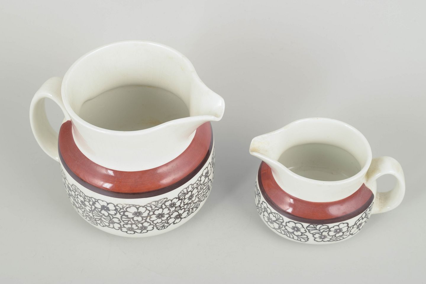 Set of two stoneware pitchers in different sizes, decorated with the characteristic Agneta floral band and warm reddish-brown border. Functional forms with a distinctly 1970s expression. Minor craquelure present.