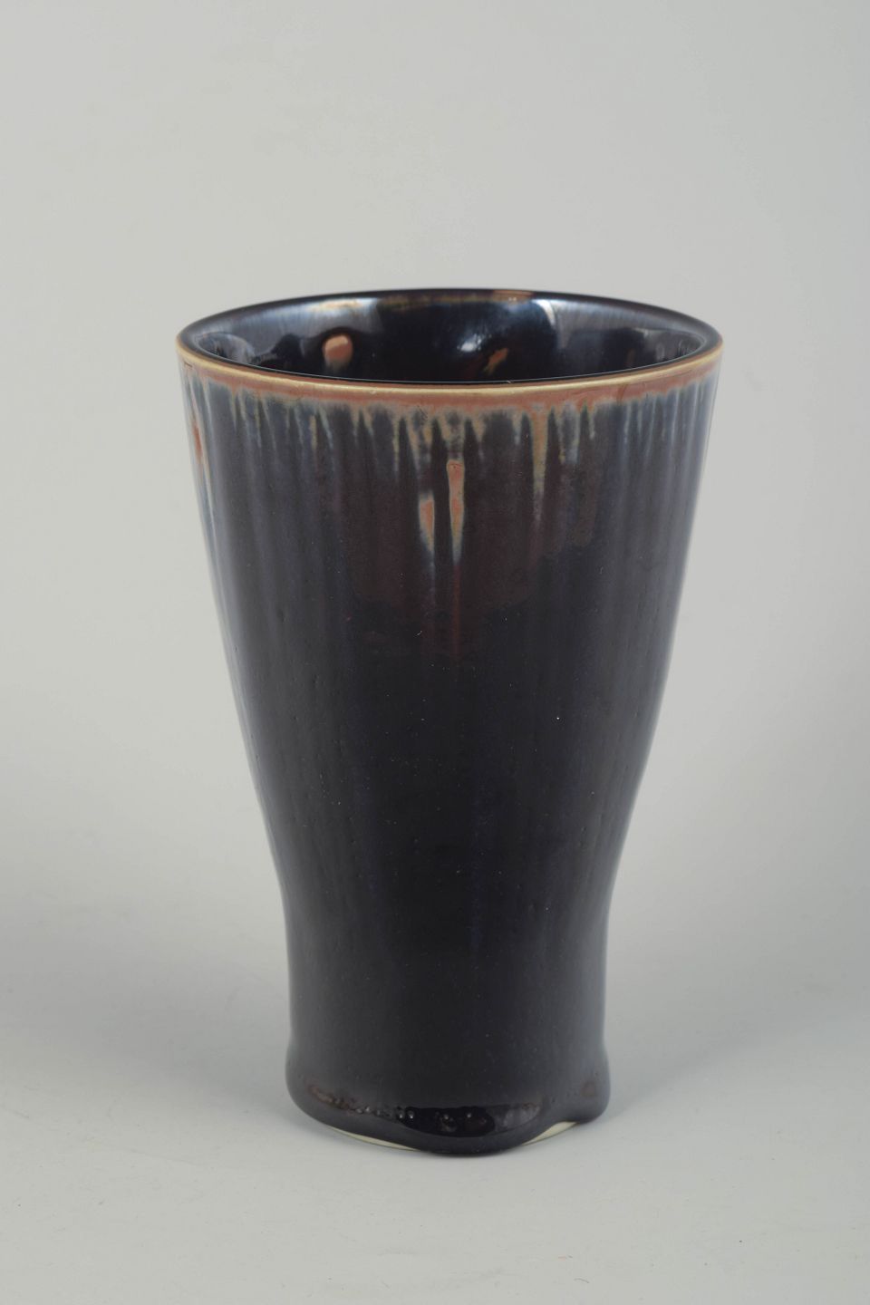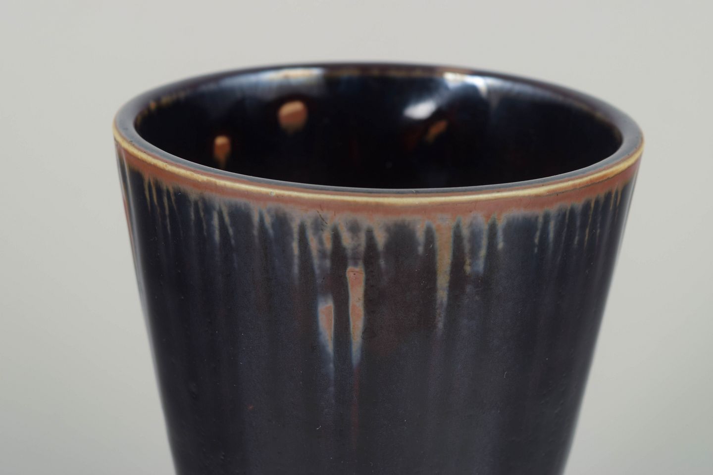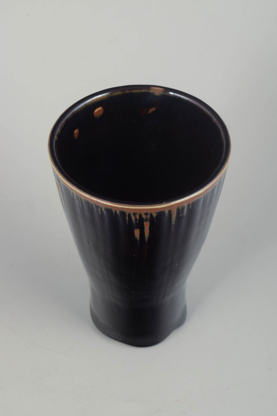 Tall, conical stoneware vase with a dark glaze featuring subtle vertical streaks that reveal lighter tones along the rim. Its simple yet refined form and deep glaze are characteristic of Rörstrand’s mid-century stoneware.