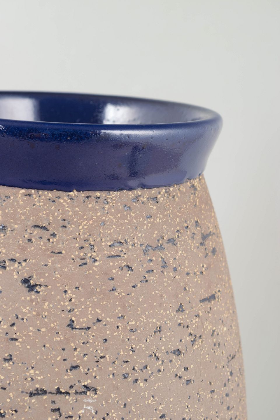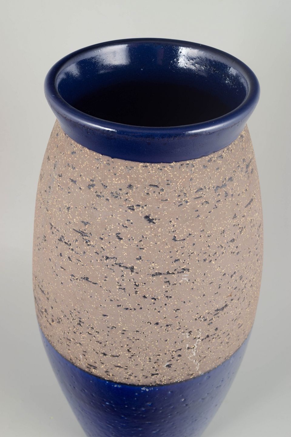 Monumental and rare vase from Simmulson’s sought-after “Atoll” series, distinguished by its striking two-part design: a raw, sandy chamotte surface on the upper half and a deep cobalt-blue glaze on the lower section. The tall, disciplined form enhances the series’ characteristic modern aesthetic. One of the larger and more seldom-seen models.