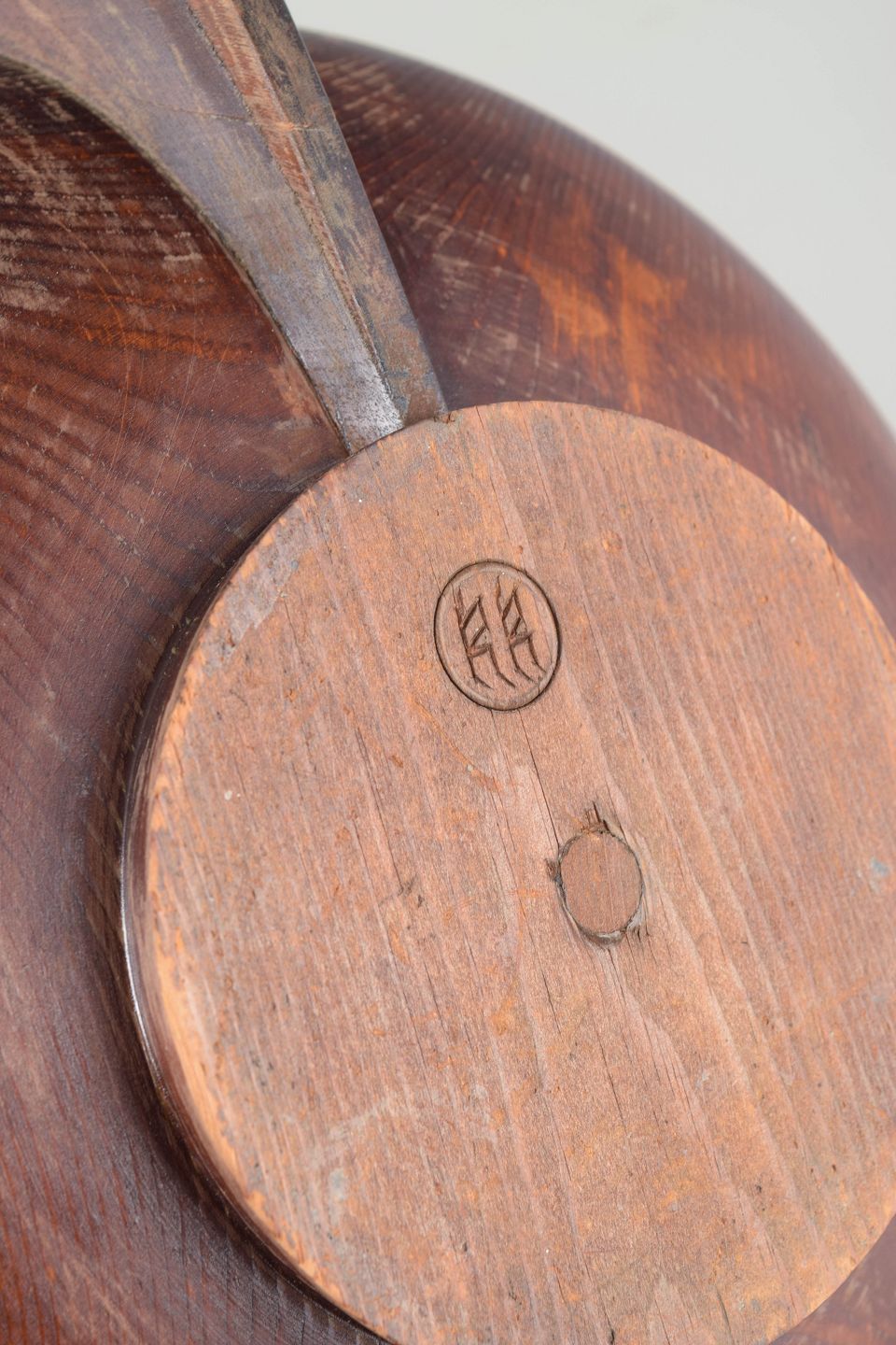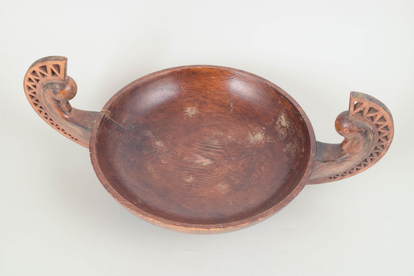 Decorative hand-carved wooden bowl featuring the characteristic dual bird-head terminals—an iconic motif closely associated with Kalevala Koru’s early design language. The warm patina and finely pierced details highlight Paaer’s ability to merge Nordic ornamentation with functional craftsmanship.