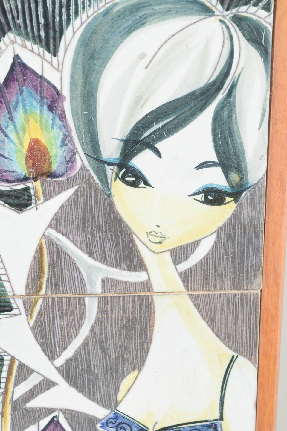 Decorative ceramic wall plaque hand-painted in the characteristic style of Yngvor Blomström for Tilgmans, Gothenburg. The motif depicts a stylised female figure with bold graphic lines and colourful details, typical of Tilgmans’ modern aesthetic of the period. Signed.
