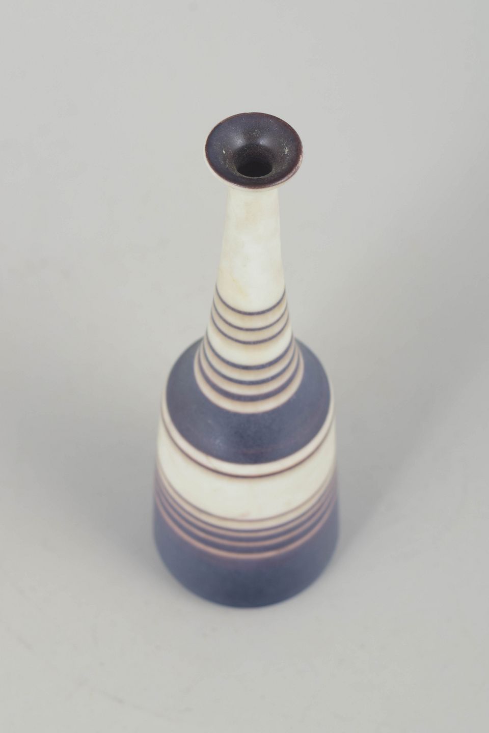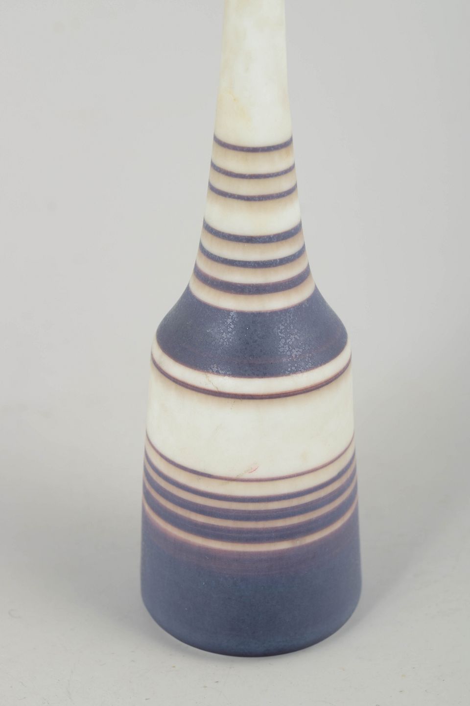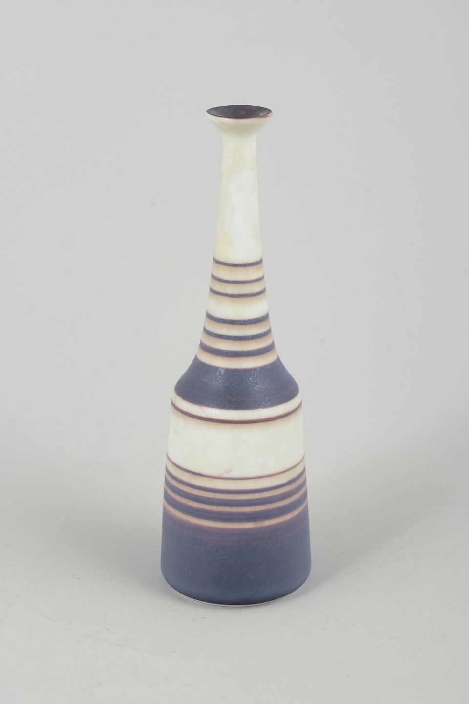Slim, sculptural stoneware vase with a unique hand-thrown expression, decorated with Nylund’s characteristic stripe pattern in matte blue, brown and white tones. The elegant elongated neck and harmonious colour balance give the piece a refined modernist presence.