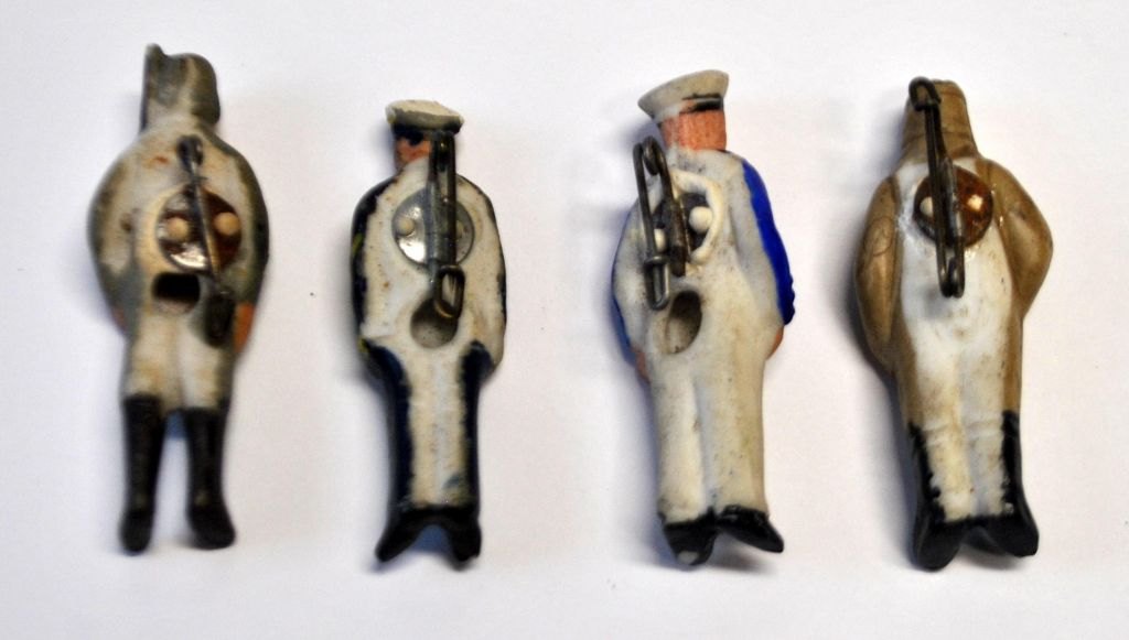 Collection of German bisque hand-painted military brooch figures, circa 1933. Figures depicted: A soldier, airman, sailor and captain in the navy. H.: 4.5 cm.Only sold together!