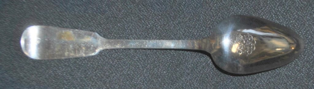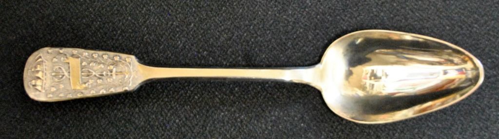 Skipper's spoon silver. 1875. Pärnus, Estonia. From the company Jacob Jacke & Co. Given as a gift to skipper JR Eriksen. Name engraved. Spoon decorated with, among other things, anchor and sailing ship. Unknown silversmith. L.: 21 cm. With engraving on the laf.Item number: 28732