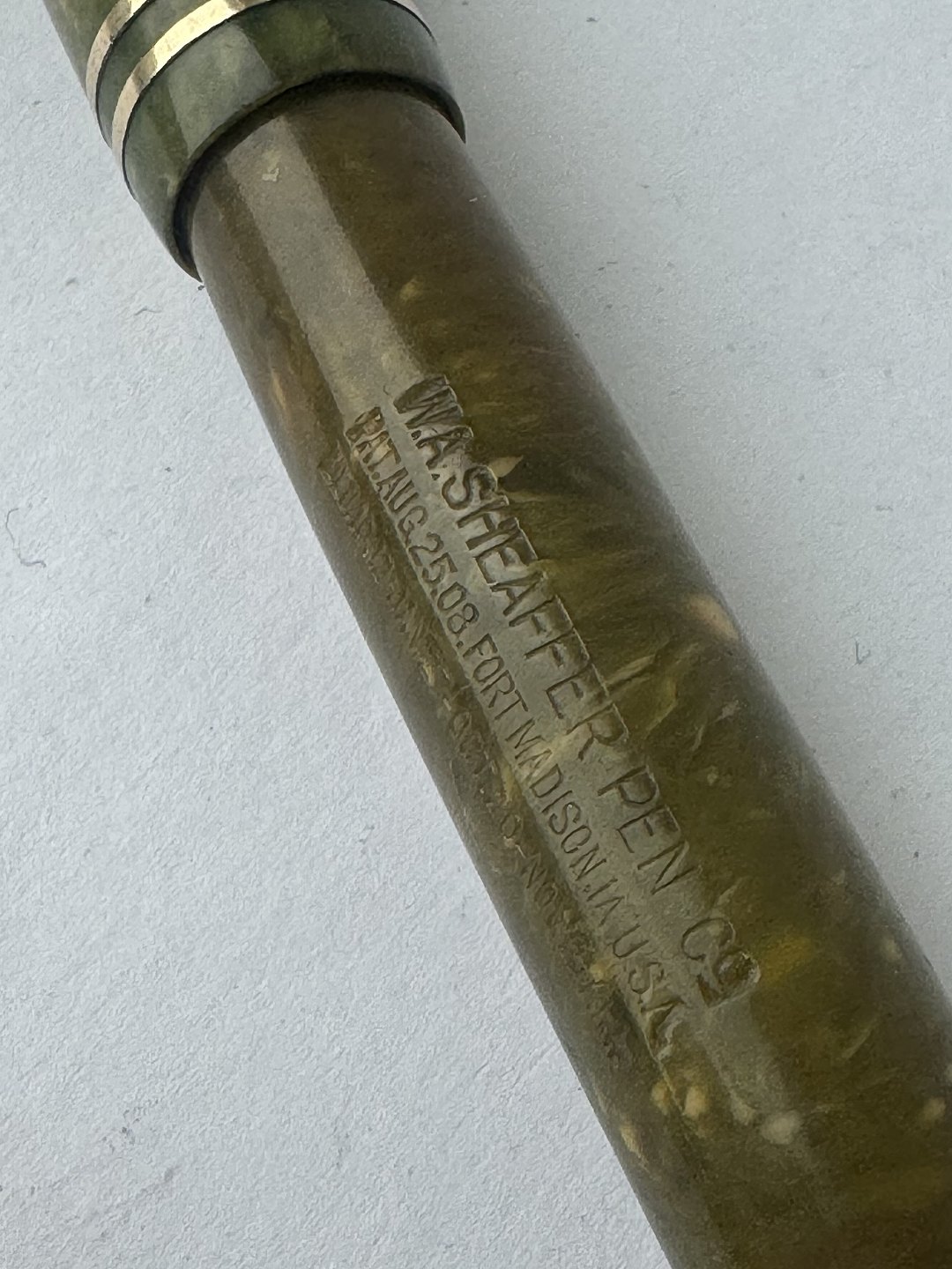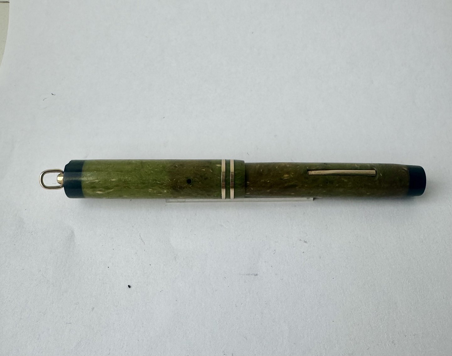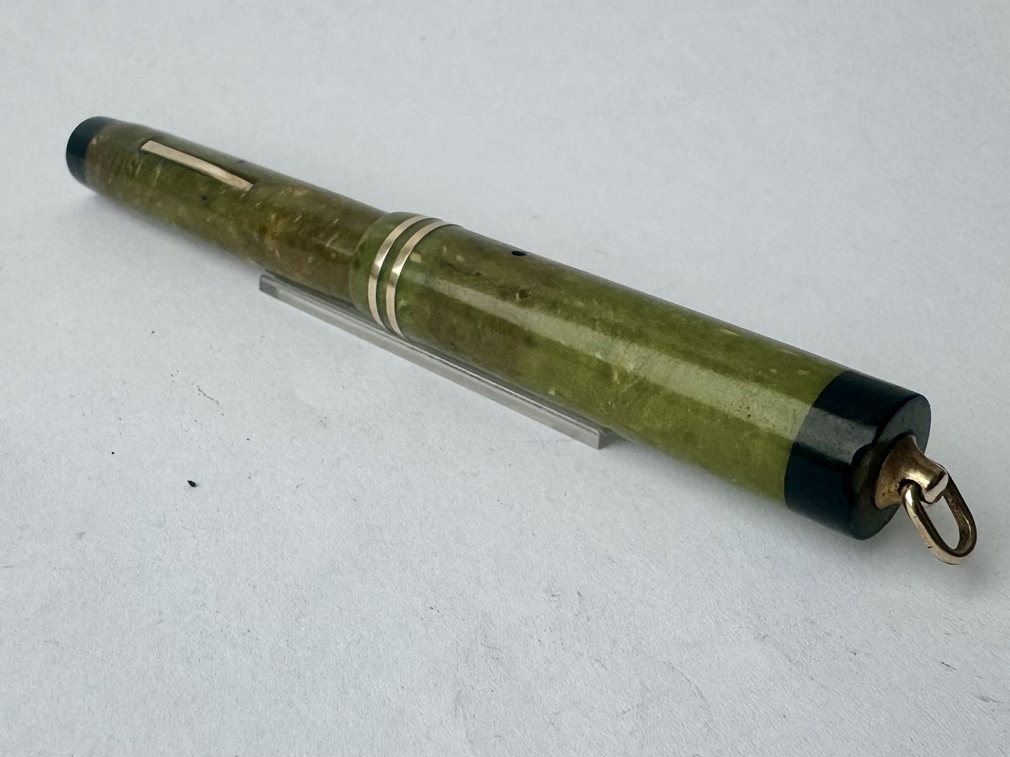 Short Sheaffer's fountain pen with lever filler. Small eyelet mounted at the top of the cap. Before the fountain pen works again, a new rubber sack must be inserted so that ink can be refilled. Otherwise in fine condition with all original Sheaffer's parts. Length: 11.8 cm Dealer