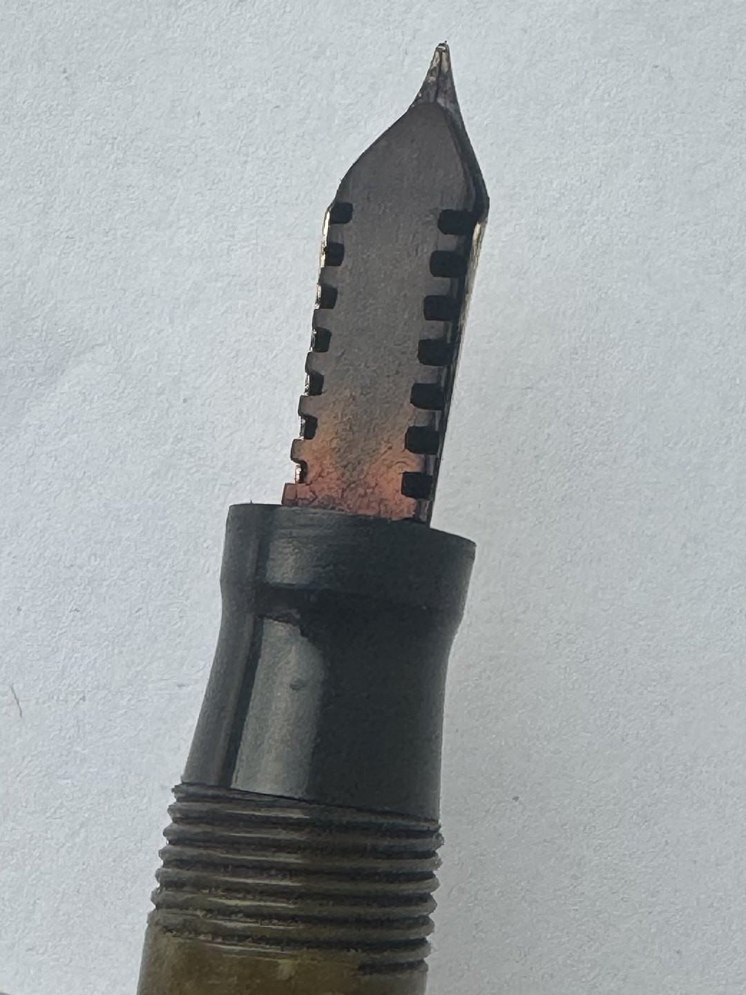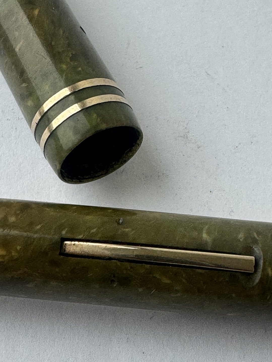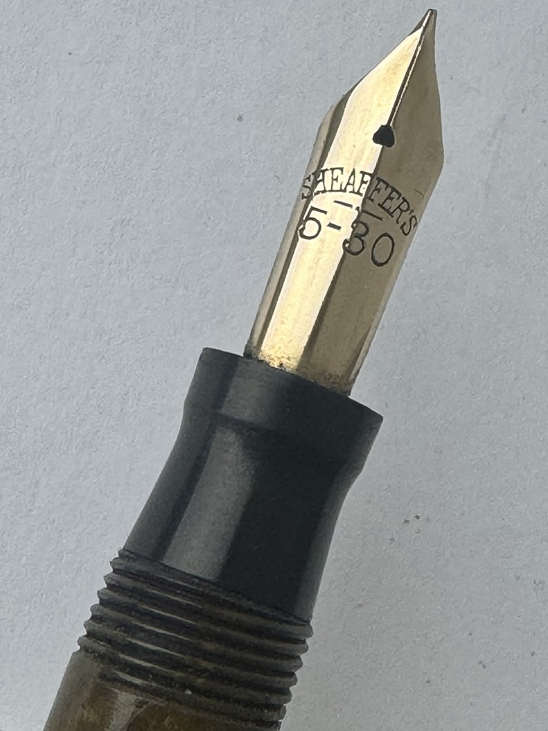 Short Sheaffer's fountain pen with lever filler. Small eyelet mounted at the top of the cap. Before the fountain pen works again, a new rubber sack must be inserted so that ink can be refilled. Otherwise in fine condition with all original Sheaffer's parts. Length: 11.8 cm Dealer