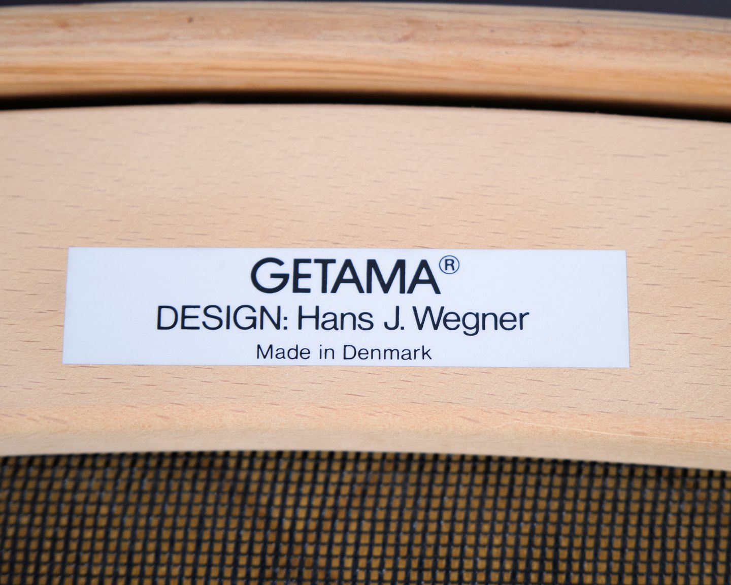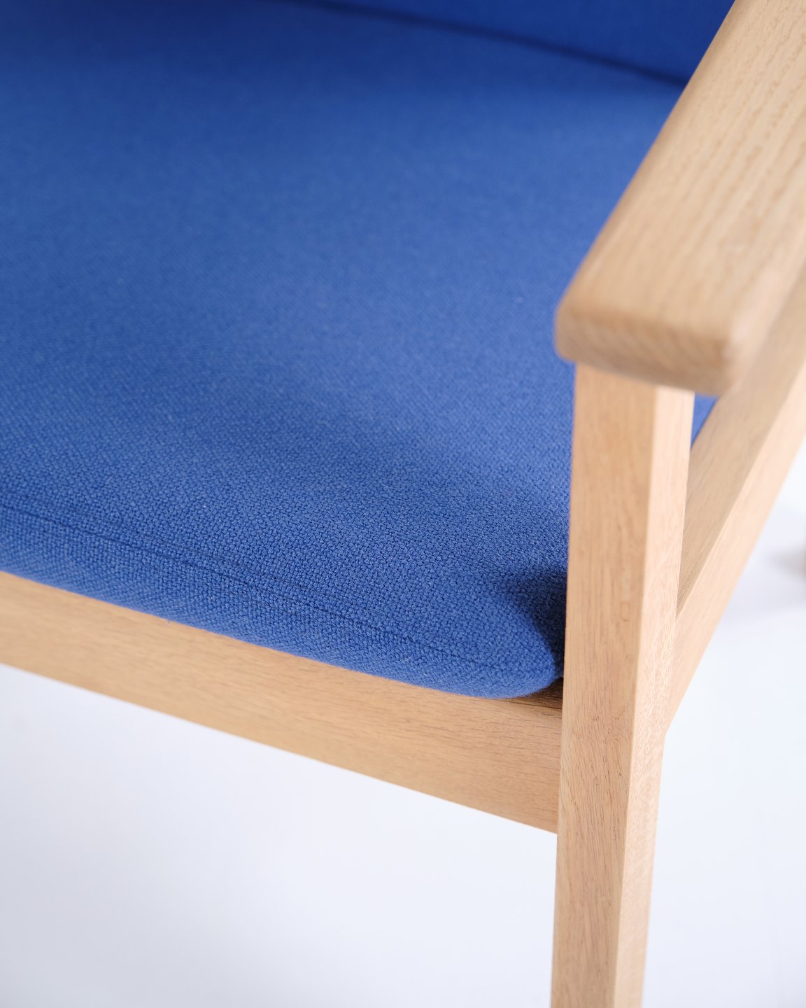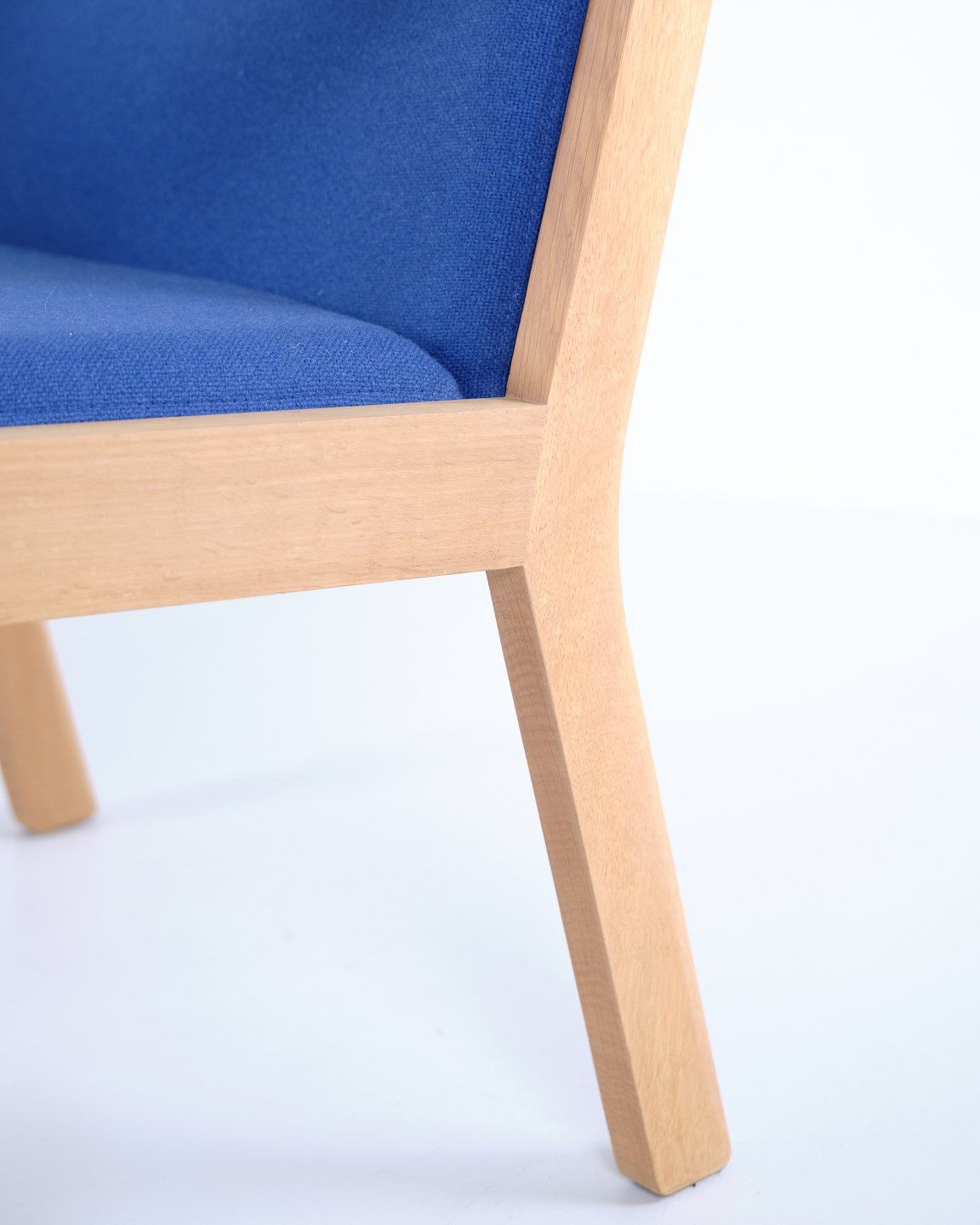 Lounge chair model GE 284 designed by Hans J. Wegner and produced by Getama. Made with a solid oak frame and loose cushions upholstered in blue wool. A classic Wegner design offering comfort and a compact form suitable for both modern and traditional interiors.— Designer: Hans J. Wegner