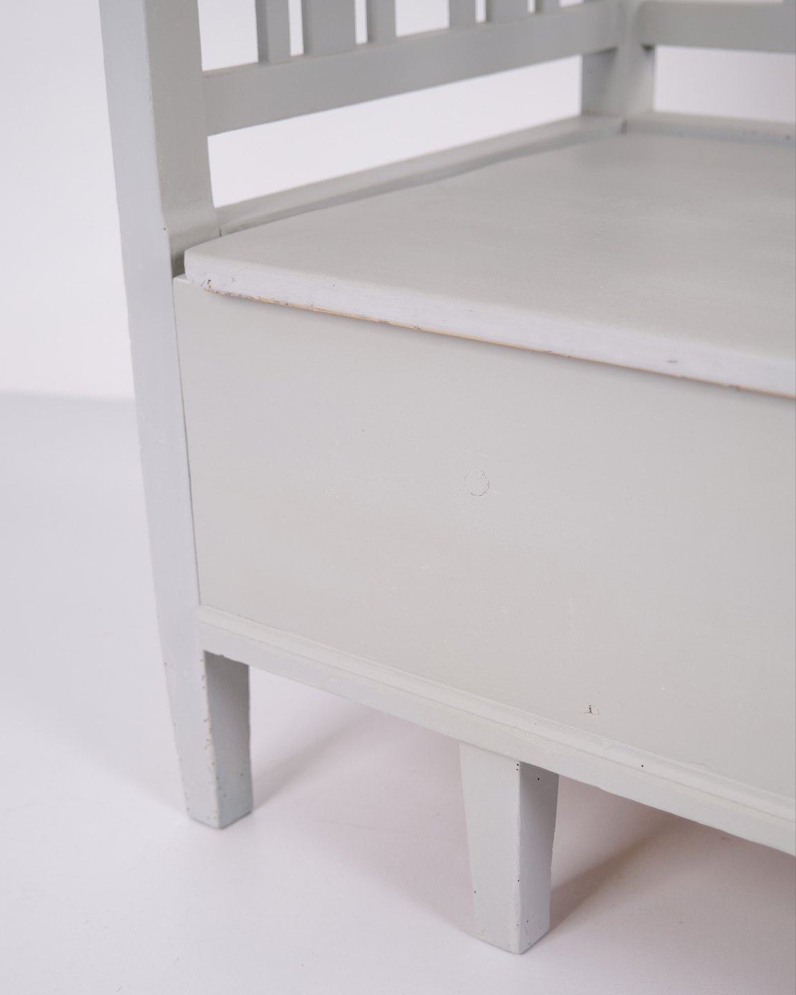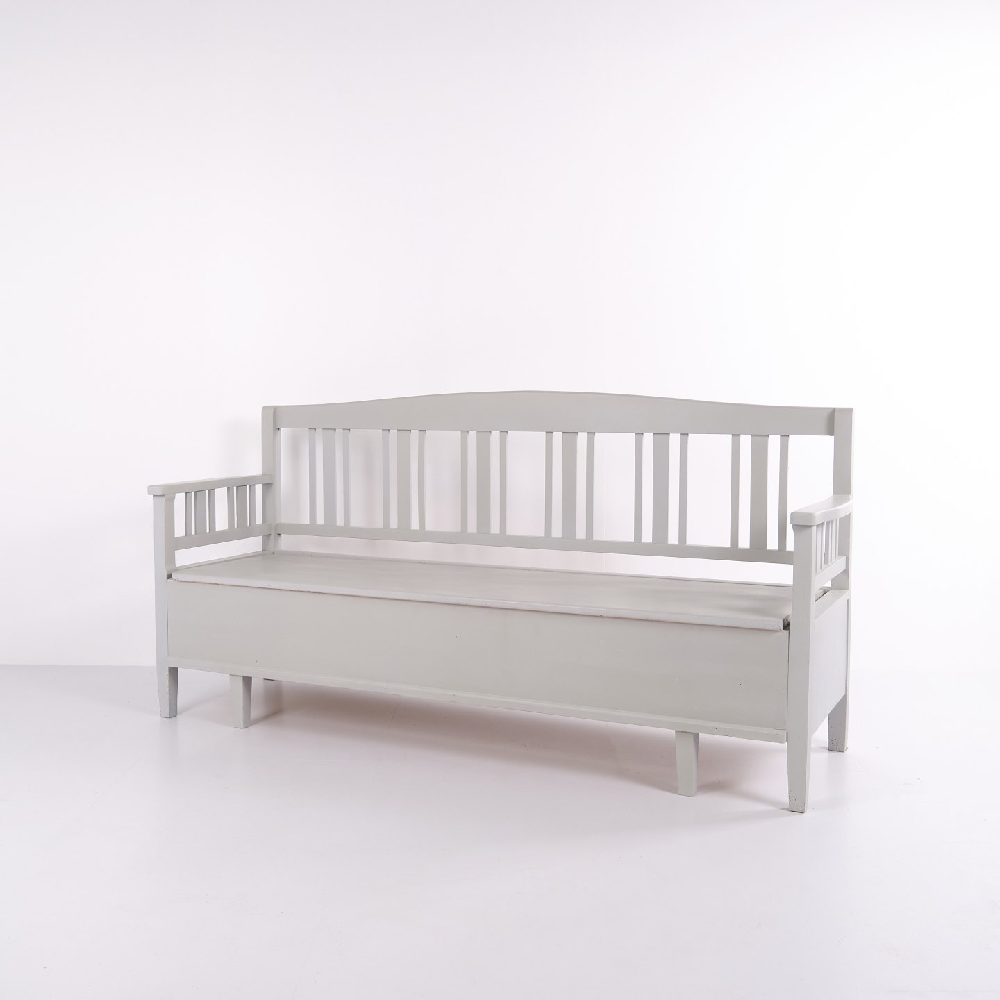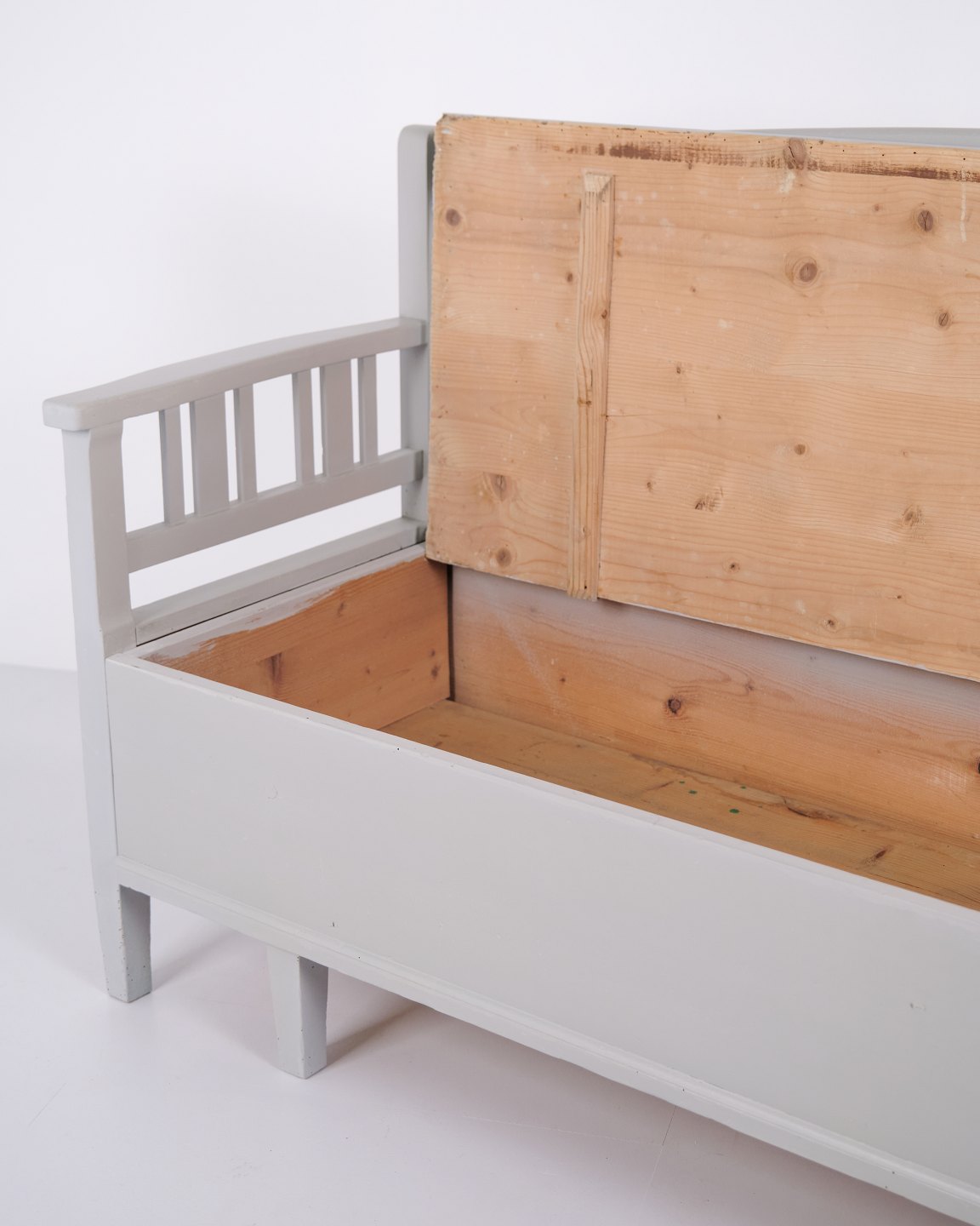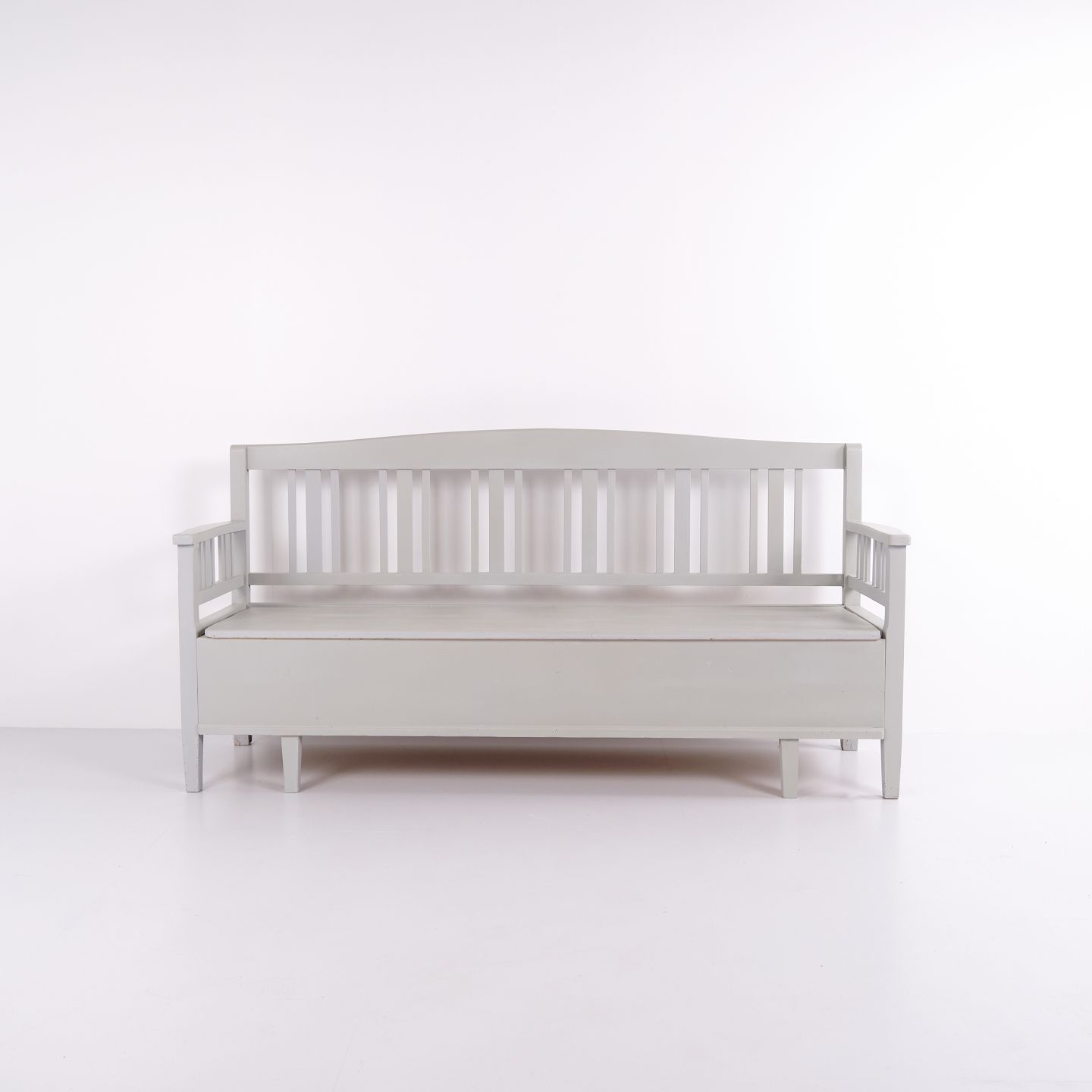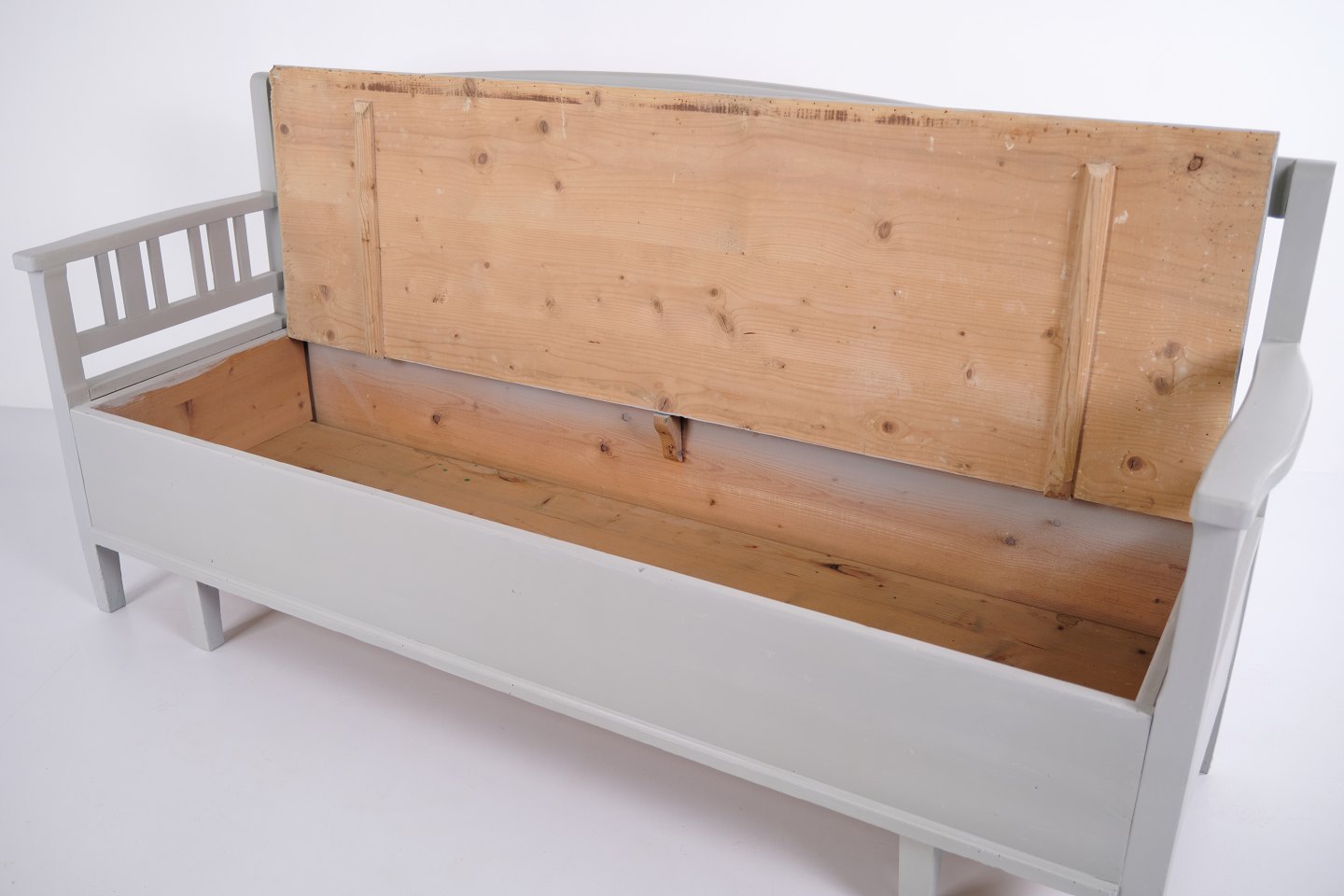 Swedish bench from the 1860s, made in pine and later painted grey. A classic Scandinavian piece with decorative painted details and practical storage beneath the seat. Well-preserved antique furniture with characteristic period features.— Origin: Sweden
