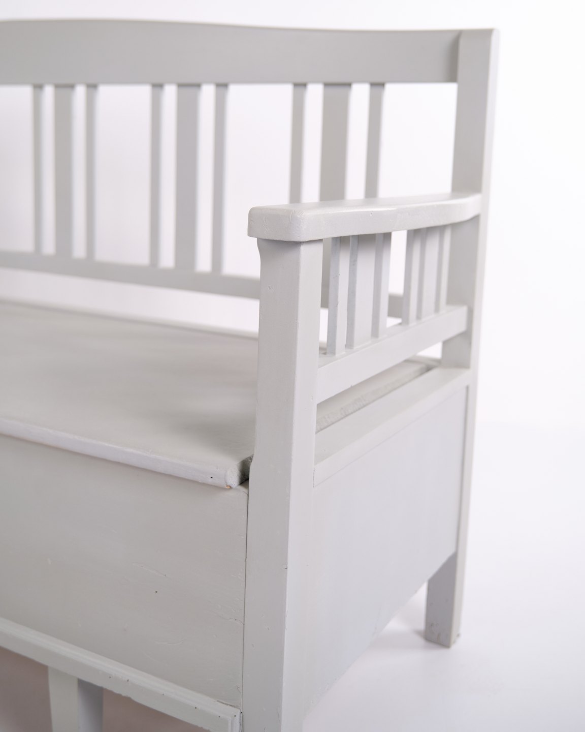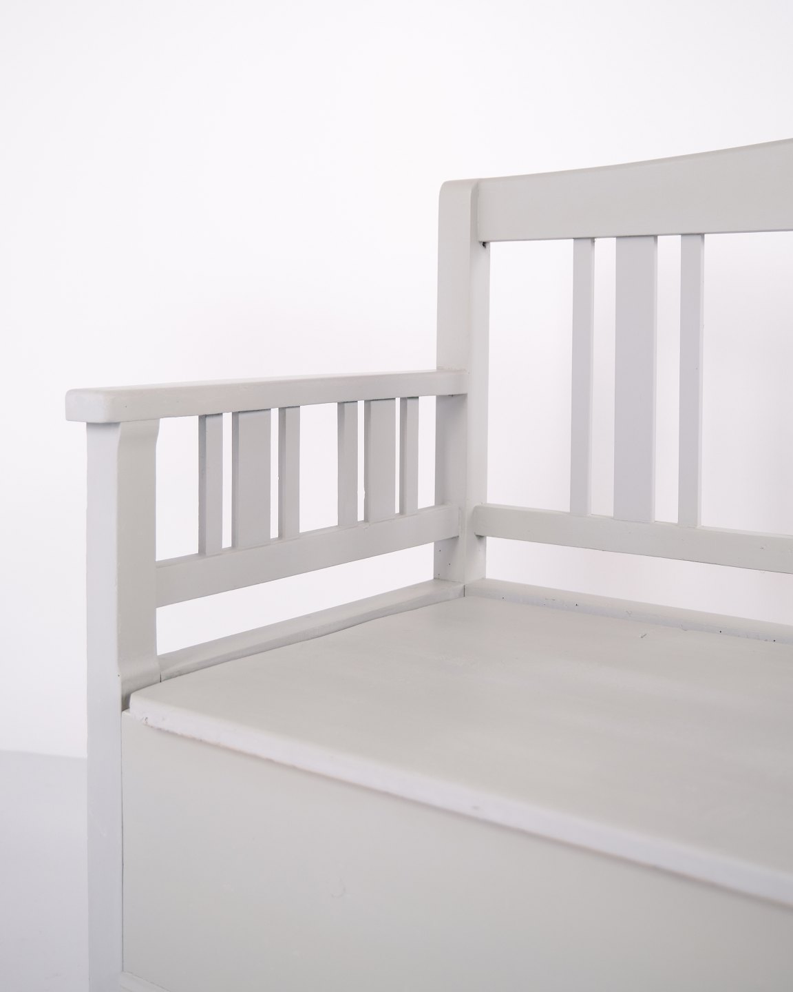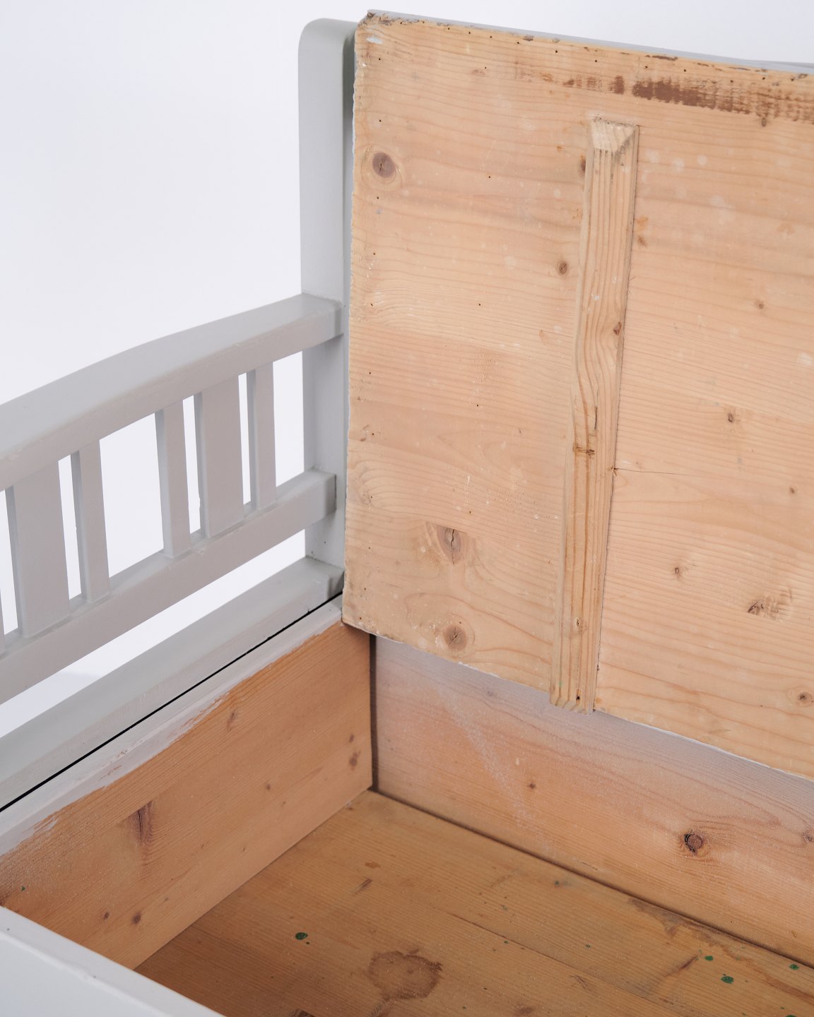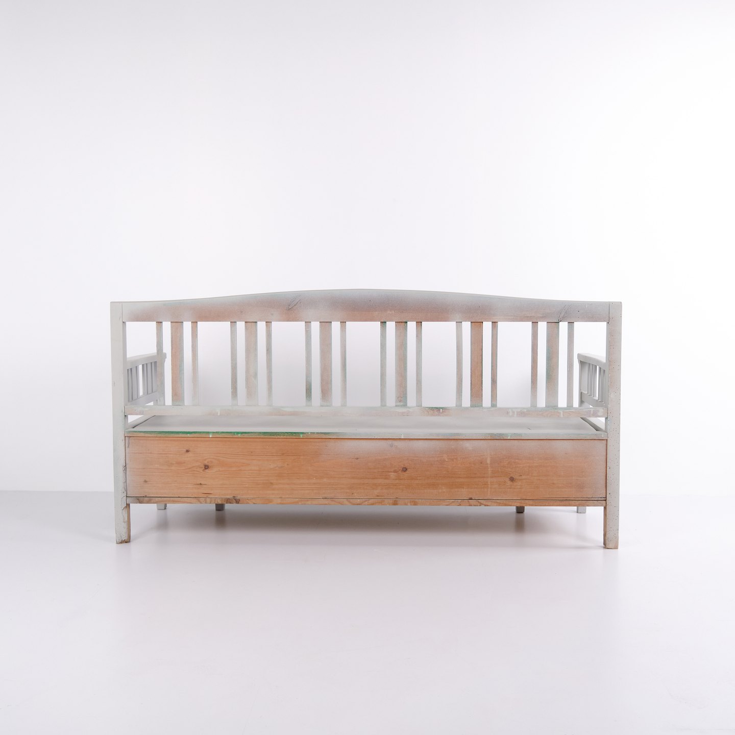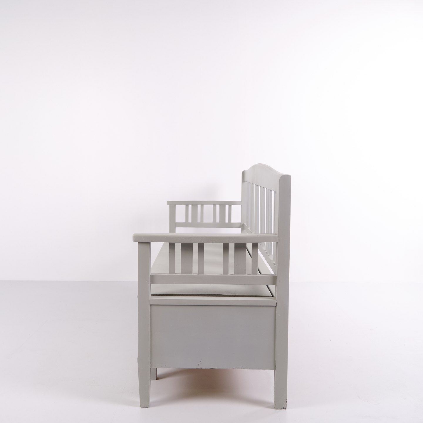 Swedish bench from the 1860s, made in pine and later painted grey. A classic Scandinavian piece with decorative painted details and practical storage beneath the seat. Well-preserved antique furniture with characteristic period features.— Origin: Sweden