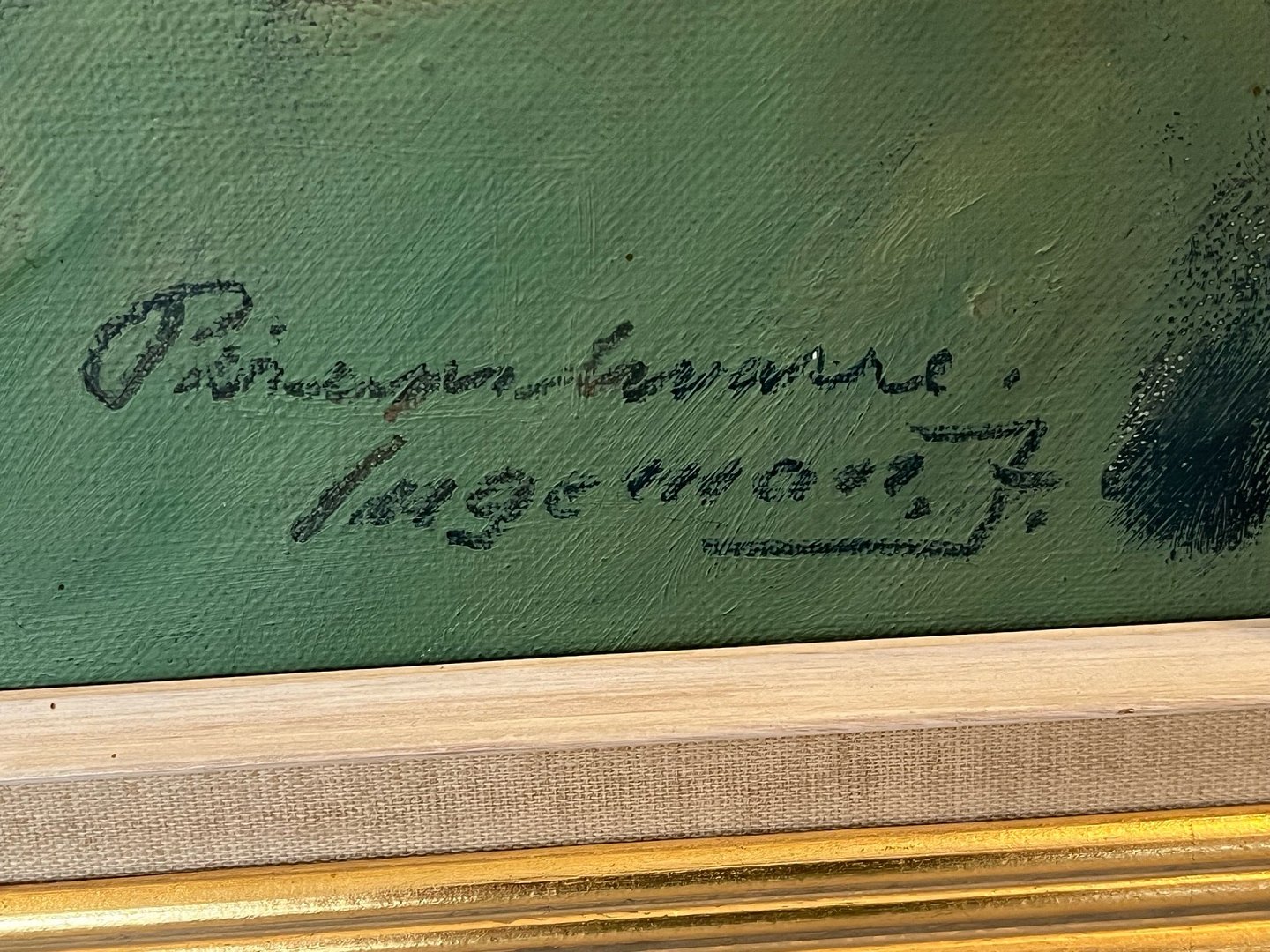 584 / 5.000This oil painting by Finpaavanne Ingeman is framed in an elegant gold frame and appears in an abstract or impressionistic style with distinctive brushstrokes and a vibrant choice of colors. The motif appears to depict a green, hilly coastline meeting the water under a sky in white and blue shades. In the lower left corner there is a signature, which is difficult to decipher. The photograph was taken indoors, where the painting is placed against a wall; a washing machine and a bag are visible in the foreground. The work is in very good condition with no visible flaws. Dimensions: 114 × 85 cm Delivery can be arranged.