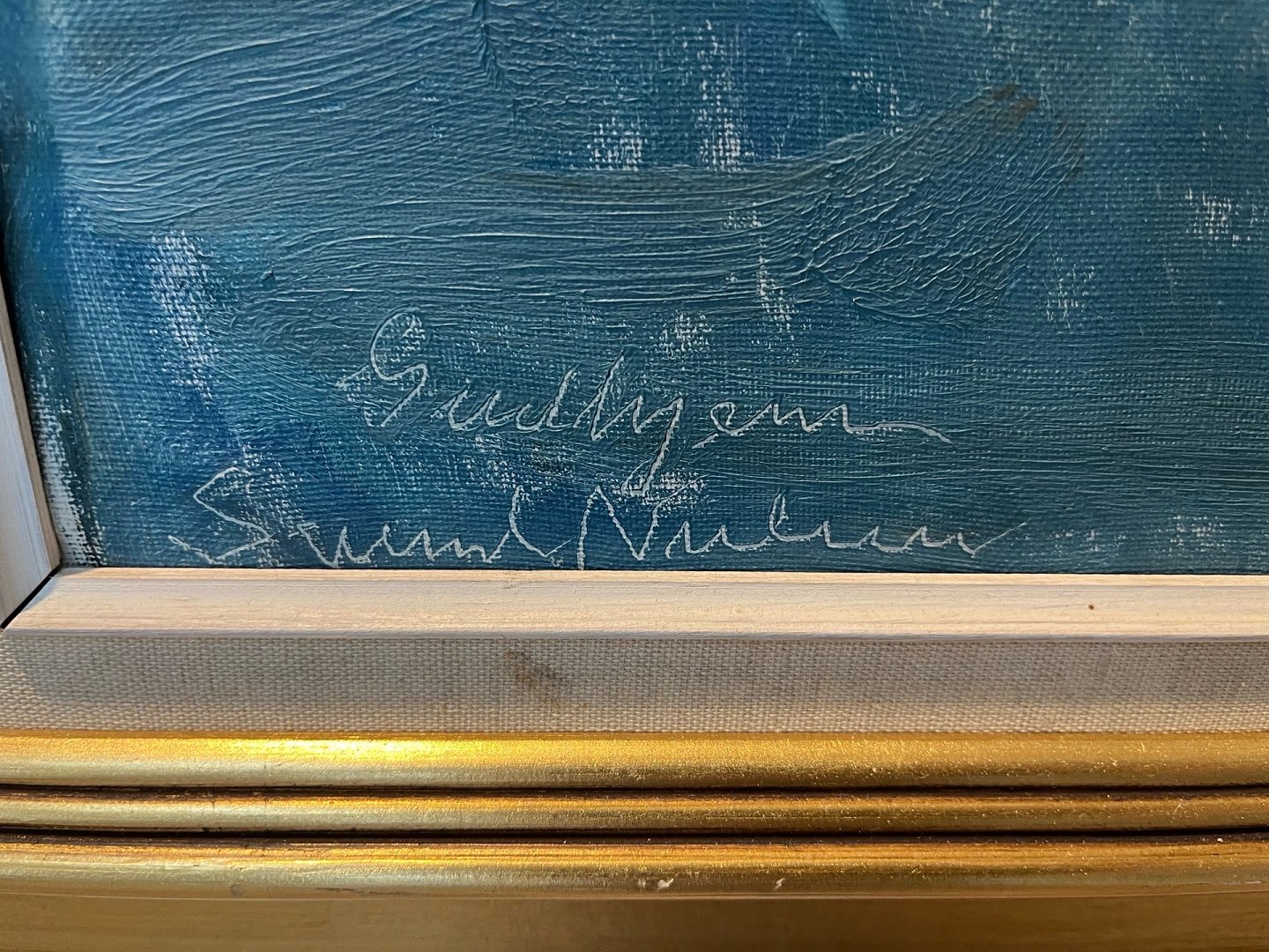 Oil painting by Svend Nielsen in a gold frame, depicting a winter scene with buildings and figures. The work appears in particularly beautiful and well-preserved condition. Dimensions: 93 x 78 cm. Delivery can be arranged. Dealer