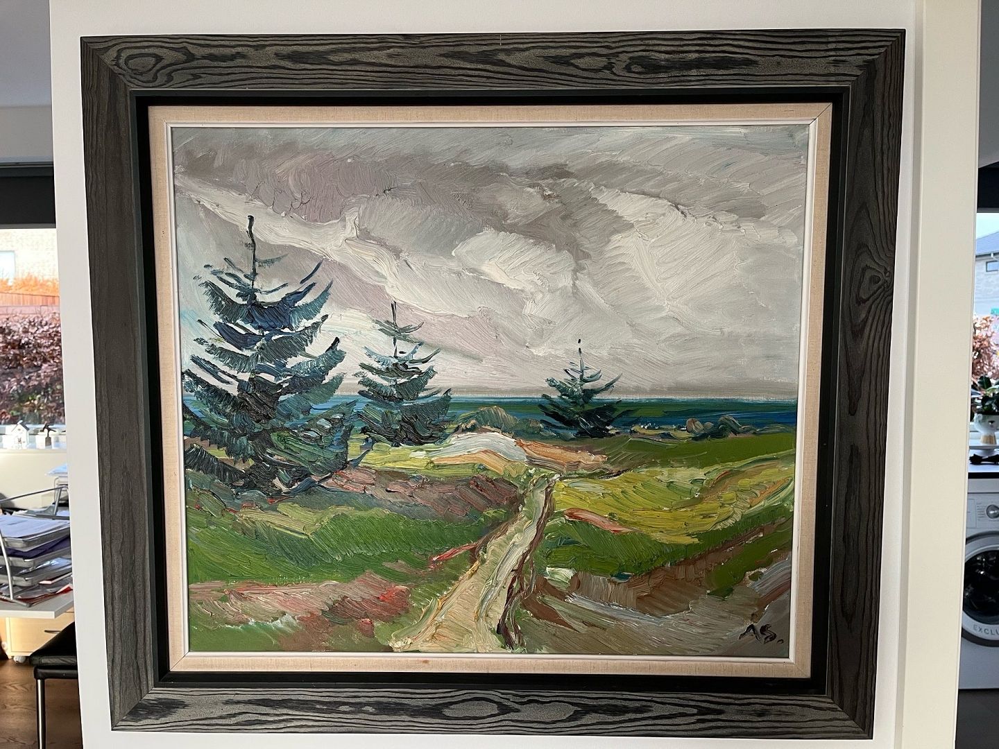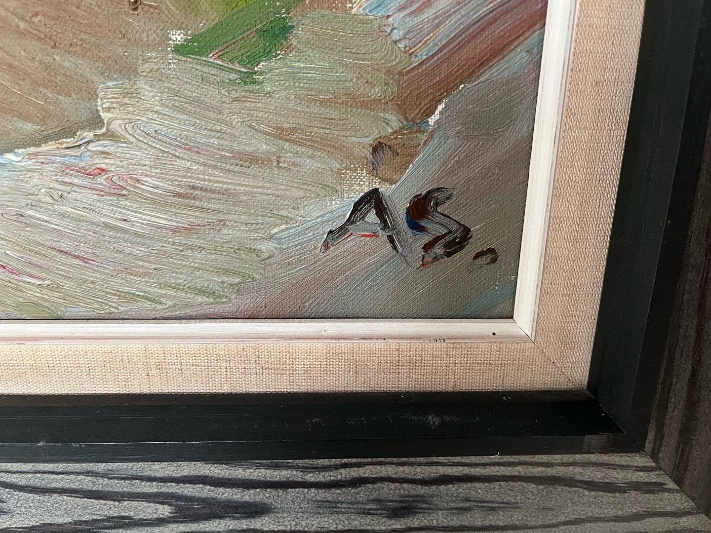The painting is a landscape painting by the Danish artist Aage Strand (1910-1975). The work is created in a modernist/impressionist style and is characterized by a distinctive use of impasto technique, where the oil paint is applied in thick layers to create clear texture and depth. Information about the work:� Artist: Aage Strand (1910-1975), Danish painter.� Style: Modernism/Impressionism, characterized by visible brushstrokes and a focus on the play of light and color.� Technique: Oil painting on canvas executed with impasto.� Motif: Coastal or dune landscape with fir trees and water in the background - a typical motif in Strand's oeuvre, often inspired by his home region in North Jutland.� Signature: The work is signed, probably with the artist's initials �AS�, at the bottom right. Dimensions: 89x79 The painting appears in excellent condition without visible flaws or damage. Delivery can be arranged