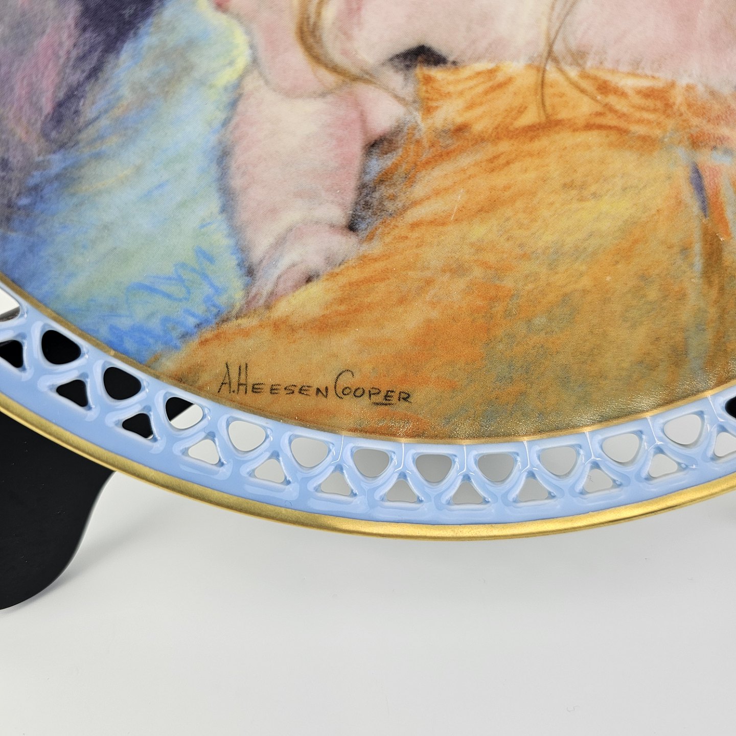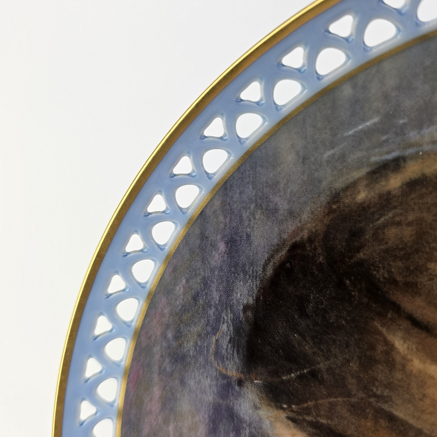 Platten er i porcelæn med overglasur og gennembrudt kant. Den er produceret i begrænset oplag, denne platte er nummer 493 af 3500.