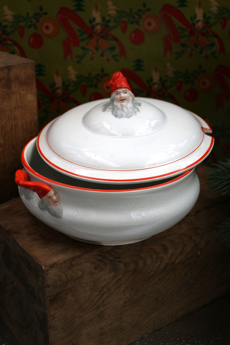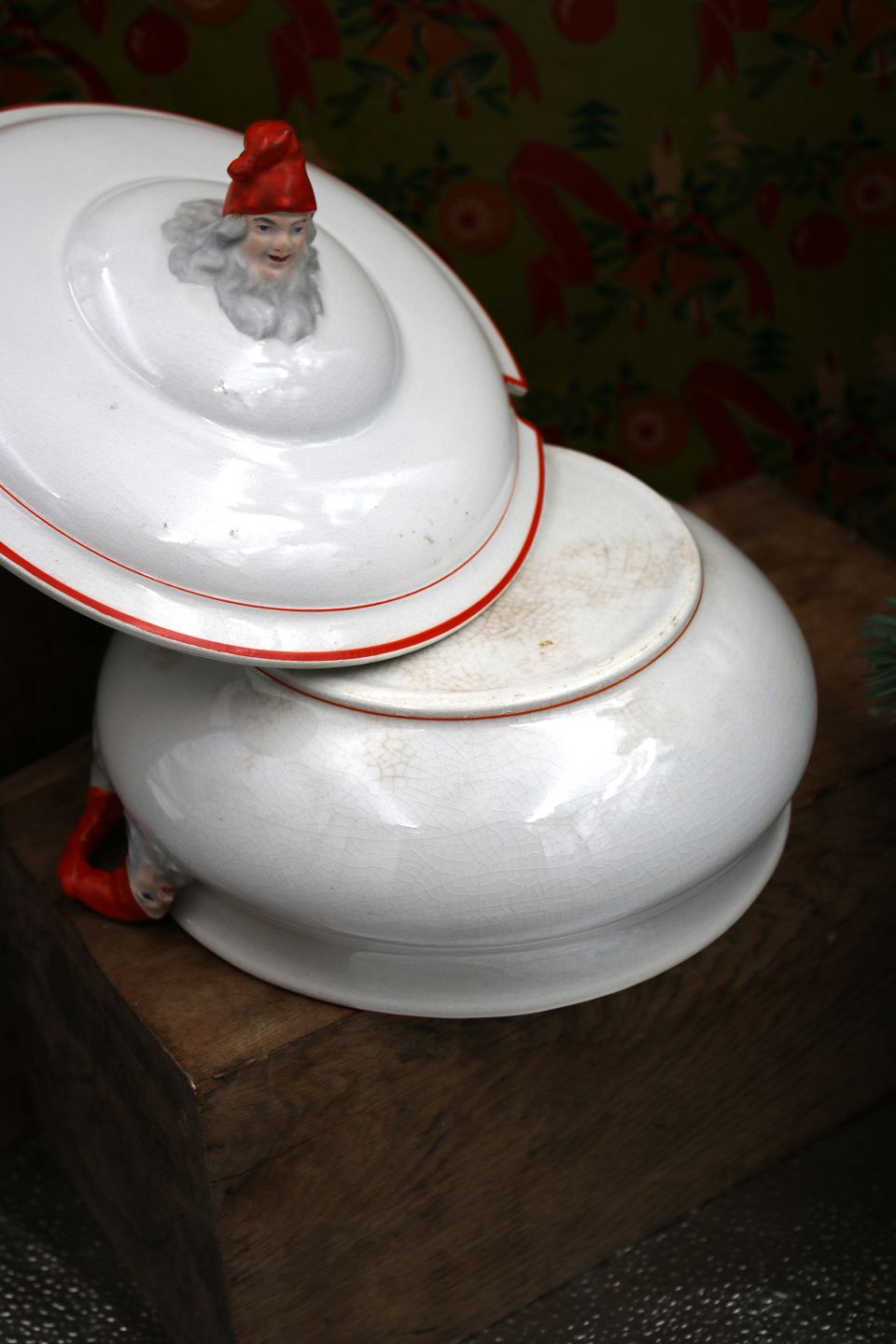 Old Swedish "Herregårds" faience tureen with a gnome on the handle and on top of the lid from the Gothenburg faience factory.H: 15.5cm. Dia.: 20cm.