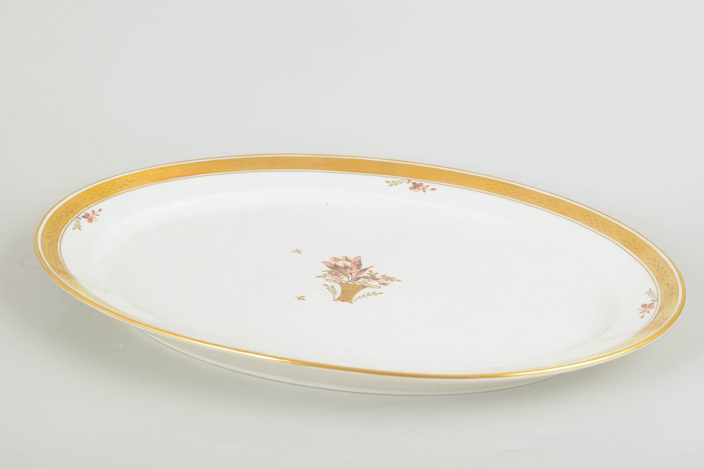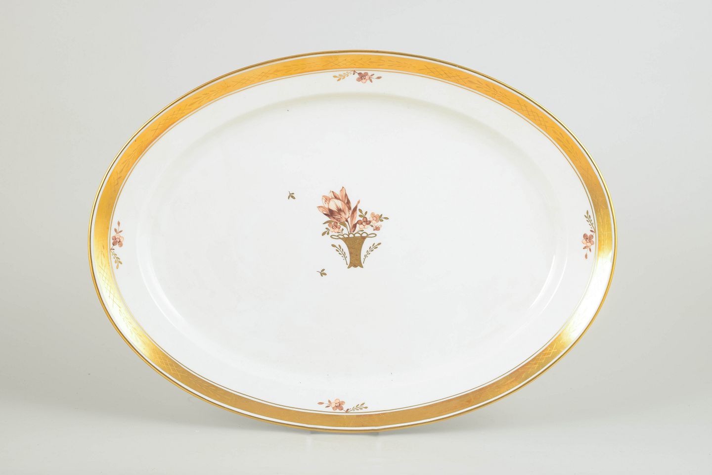 Impressive large oval porcelain serving platter from Royal Copenhagen’s “Golden Basket” series, model 595/9010. Classic white porcelain with a wide gilded rim and the characteristic hand-painted floral basket motif.