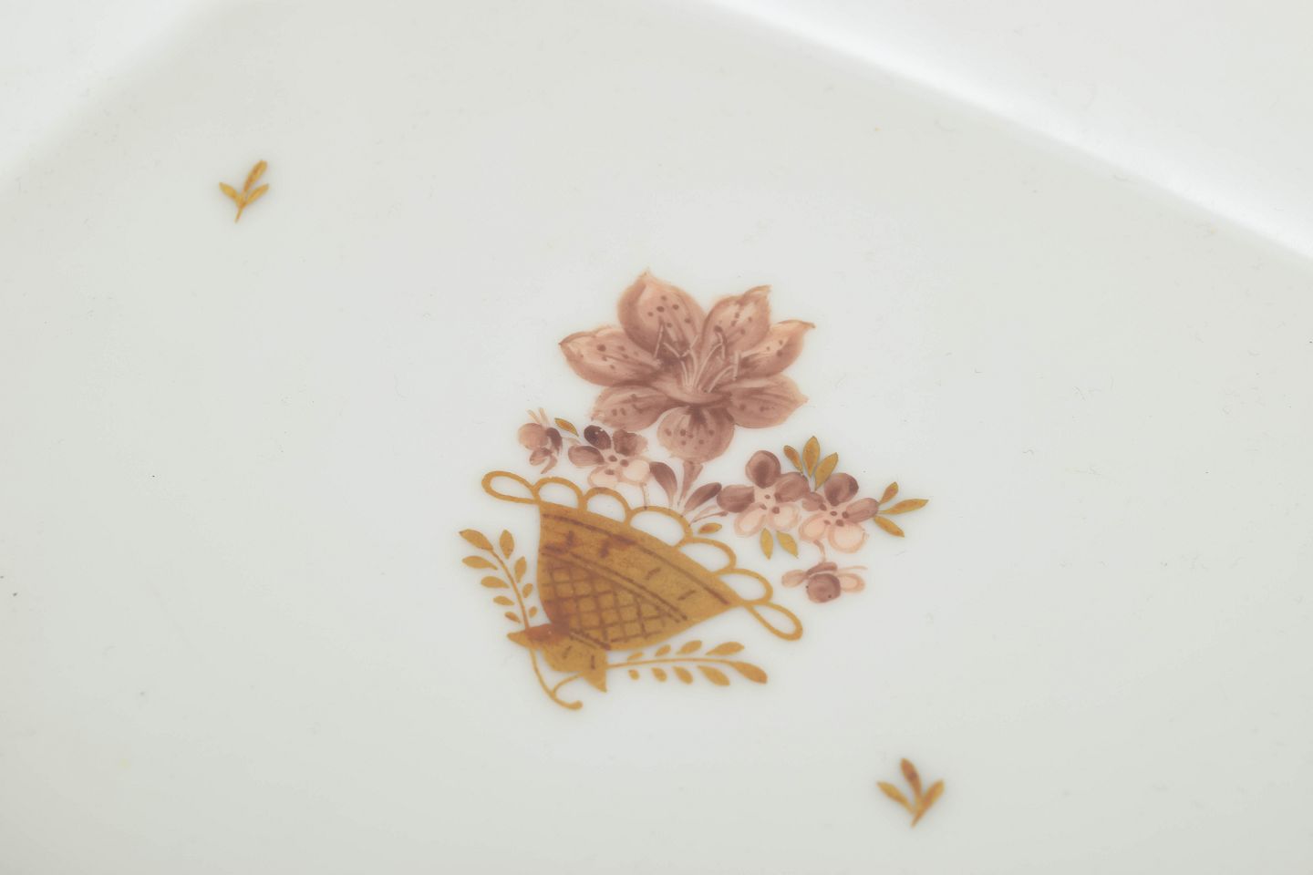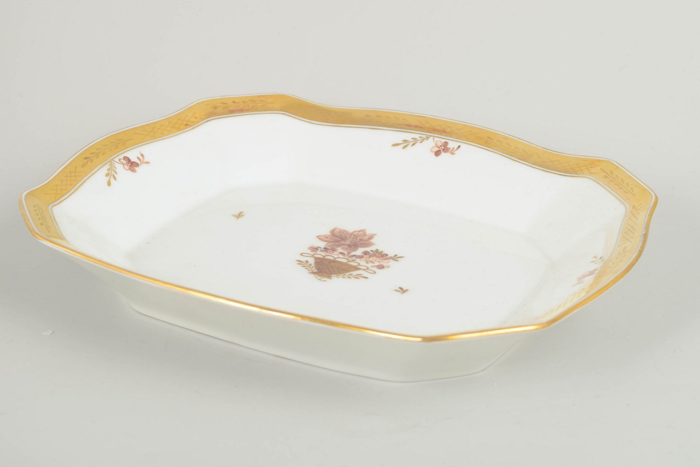 Beautiful octagonal porcelain cake dish from Royal Copenhagen’s “Golden Basket” series, model 595/9047. Features a wide gilded rim, hand-painted floral basket motif at the centre, and decorative floral sprigs.