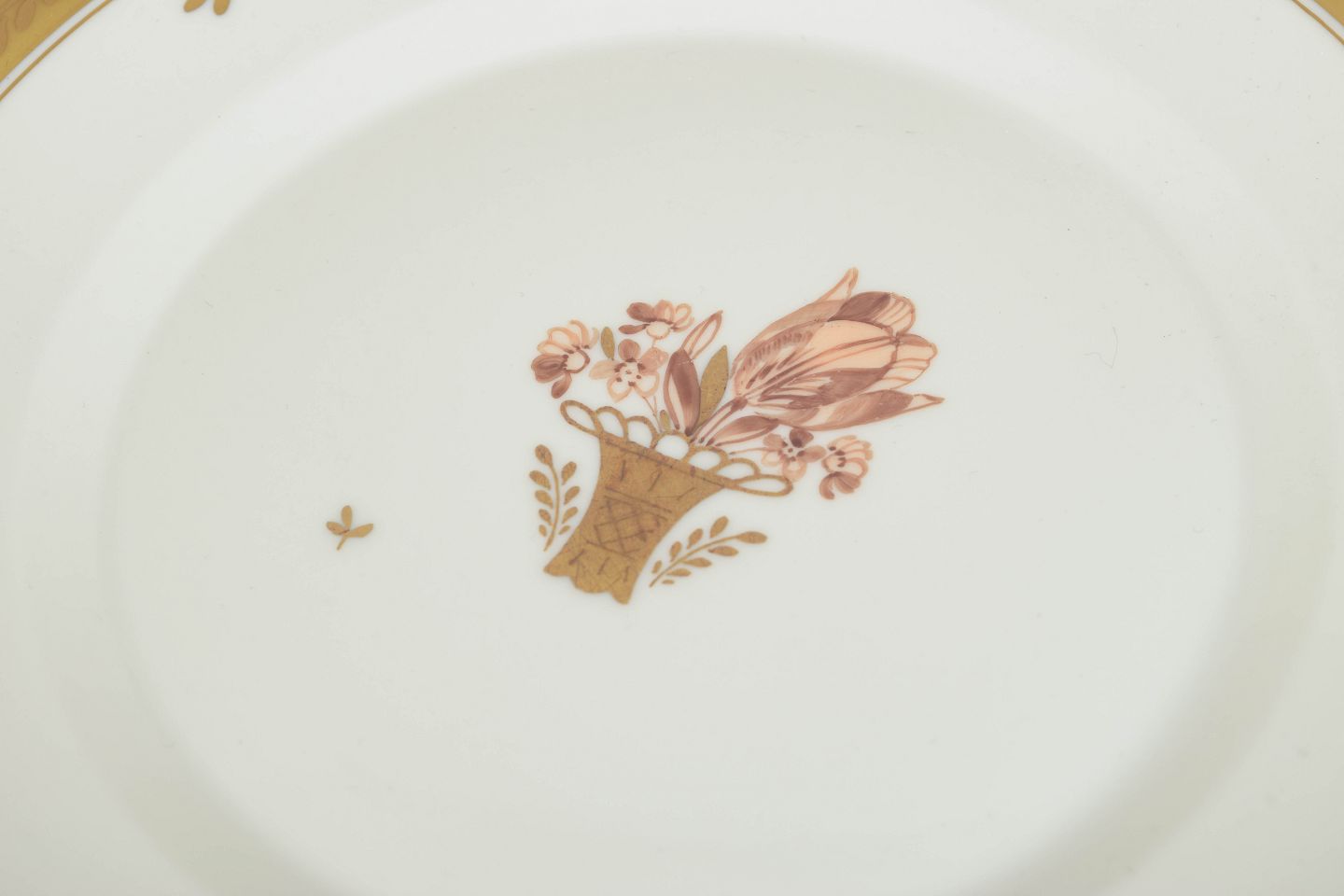 Set of five elegant lunch plates in porcelain from Royal Copenhagen’s “Golden Basket” series, model 595/9589. Classic white porcelain with gilded rim and hand-painted floral basket motif.
