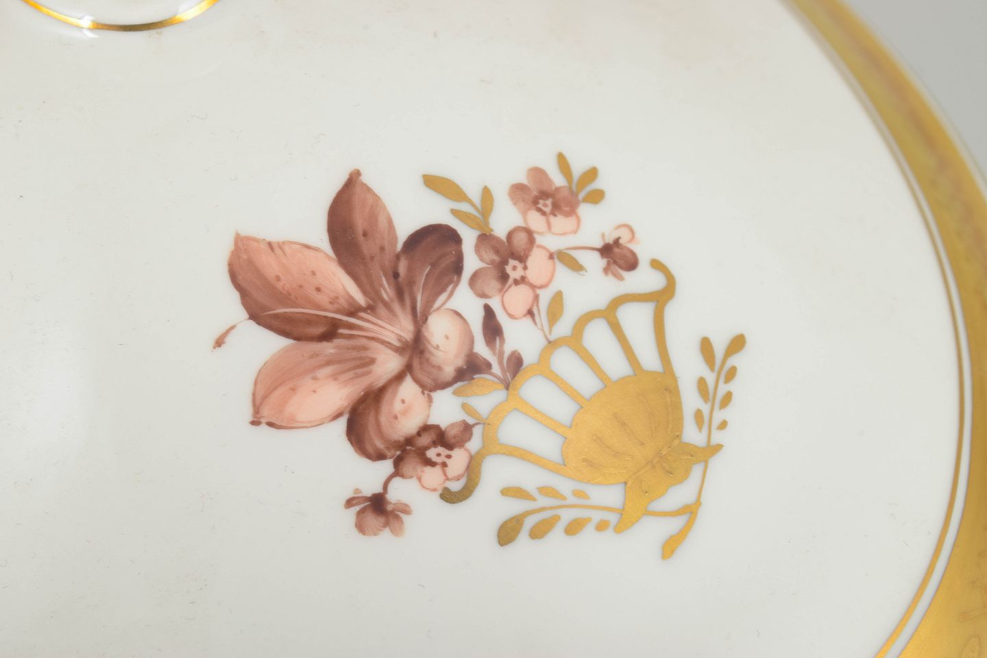 Elegant oval porcelain tureen from Royal Copenhagen’s classic “Golden Basket” series, model 595/9348. Executed in 1st quality with gilded details and hand-painted floral decoration. With lid.