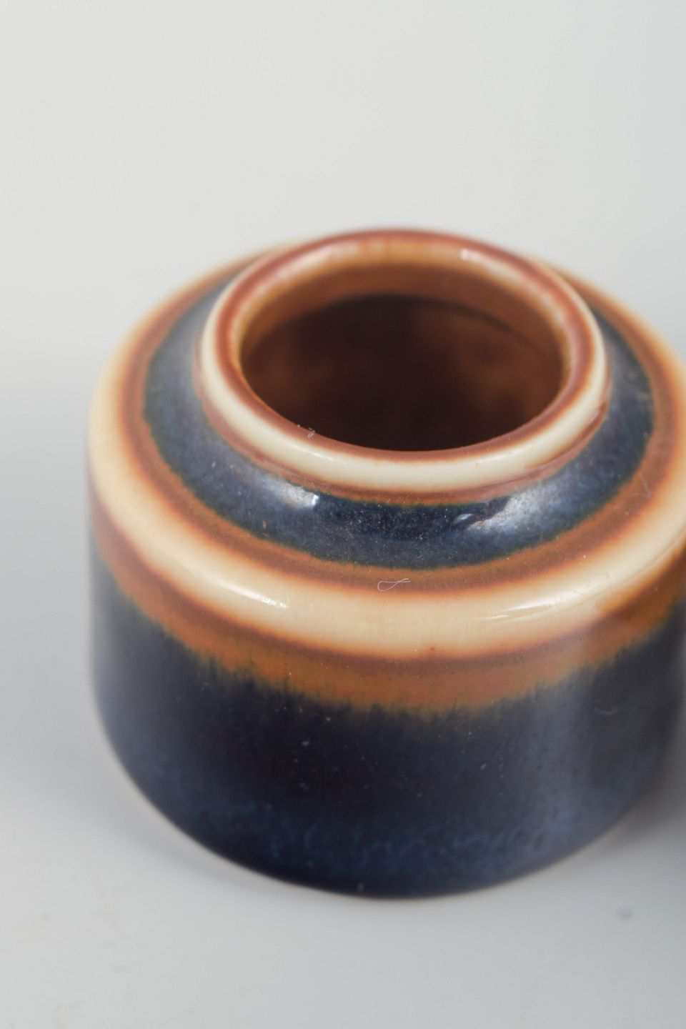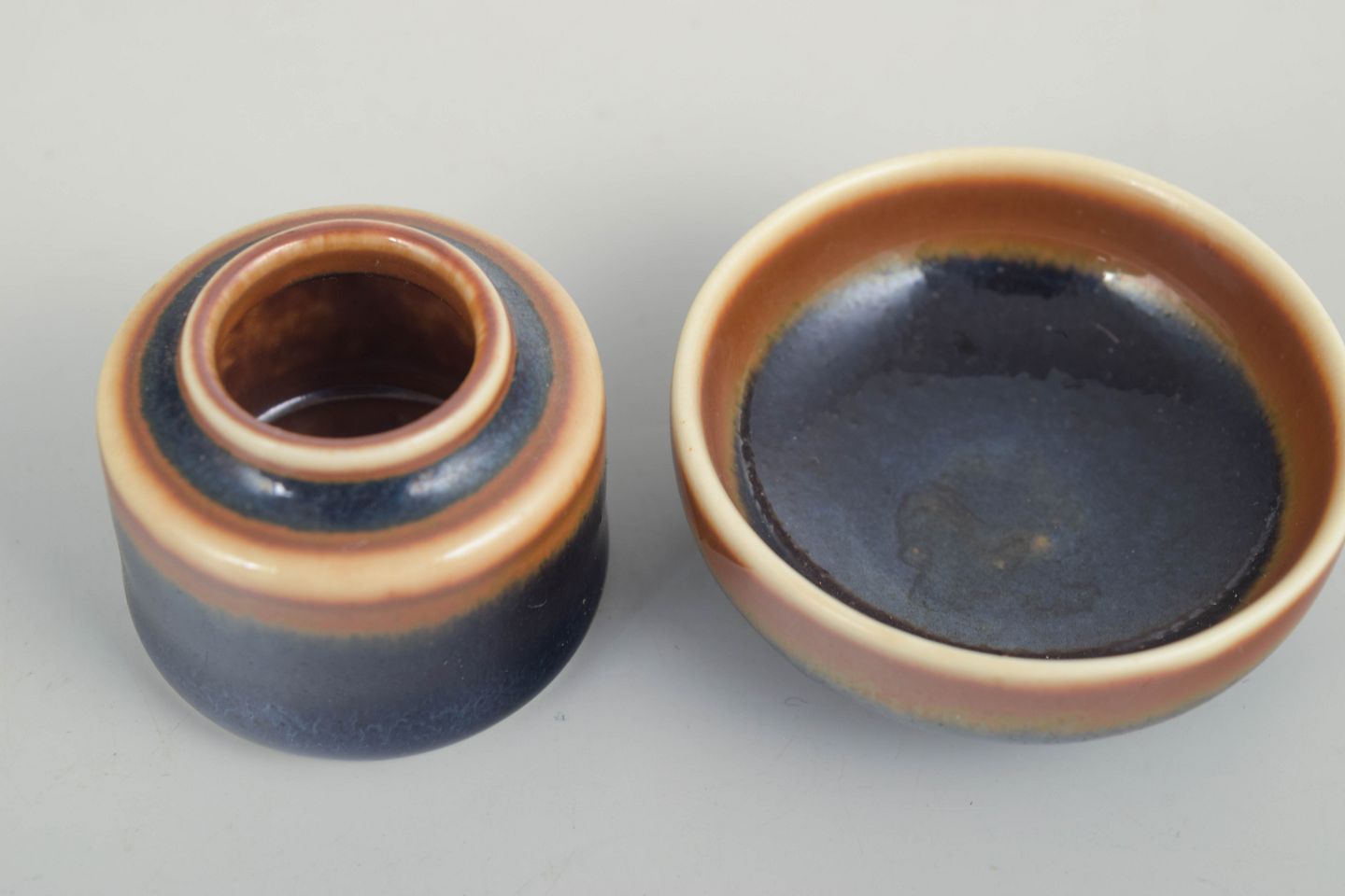 Two small stoneware pieces in the classic Stålhane idiom with deep blue-violet glazes subtly blended with warm pink and brown tones. The forms are simple and refined, characteristic of Stålhane’s work in the 1950s and 60s.