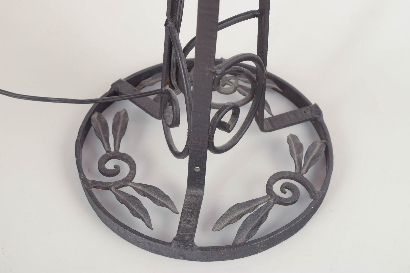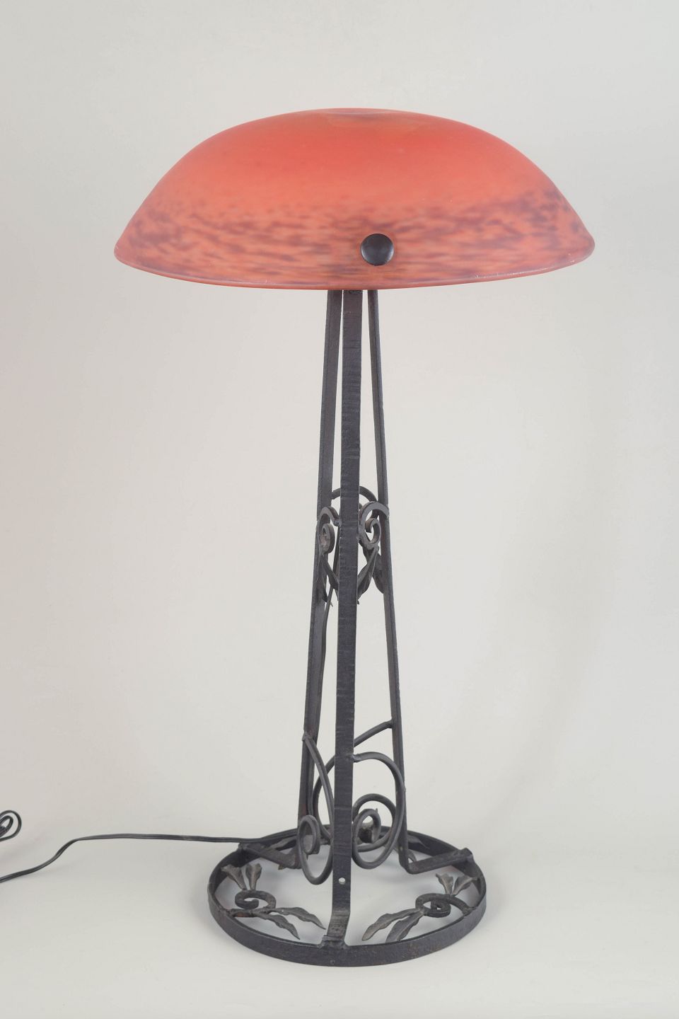 Dekorativ bordlampe i Art Nouveau-stil med støbejernsunderstel og håndlavet art glass-skærm i varme, rødlige nuancer. Den organiske formsprog og de slyngede jernranker skaber et elegant, skulpturelt udtryk.